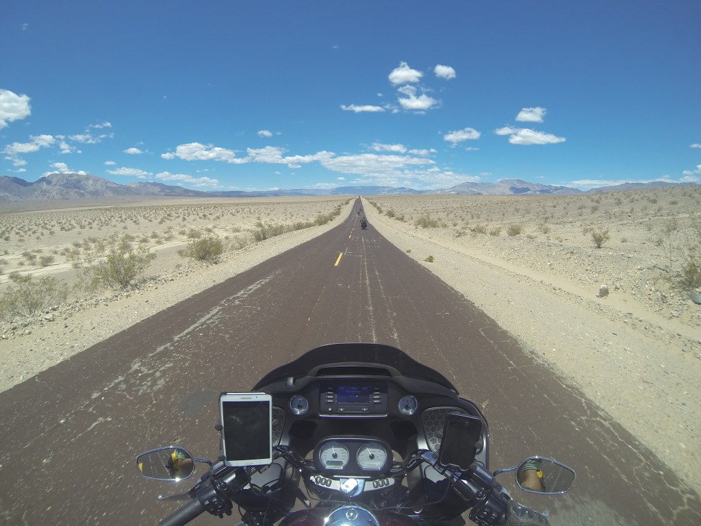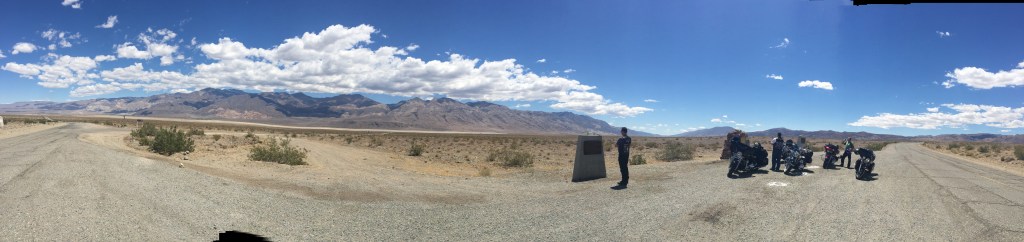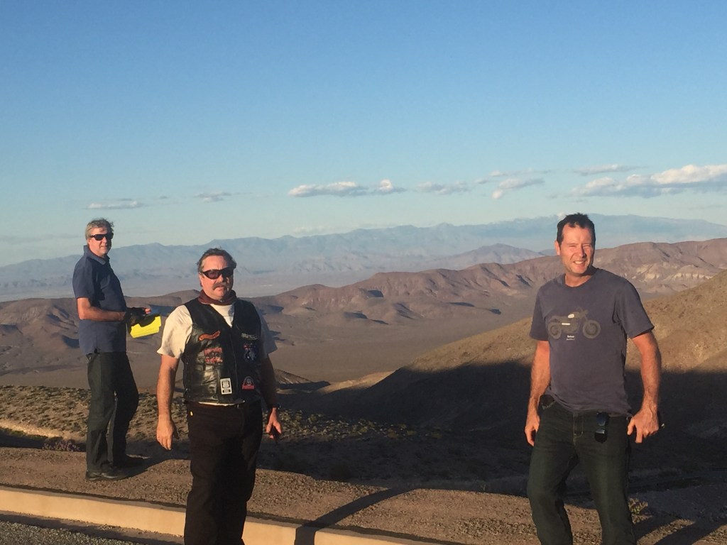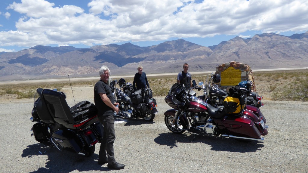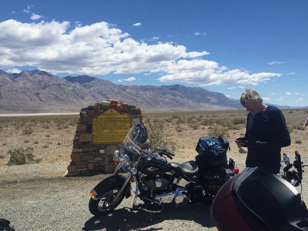 The Foxes now reverted to Desert mode as they entered Searle Valley. Things got tricky. It was a vast open space with large rock mtns painted on the horizon. It was hot & dry. Then a stealth bomber flies over followed by a FA18 which did a very low flight passover which scared us shitless. Desperate for water we stopped at Ballarat to discover it was a ghost town. We are dazed and confused so we pissed on the monument (not a tree to be seen). We pressed on regardless. Then conditions turned against us. The road became thick corrugated sand & gravel. Leaving no man behind we bounced along this track for 2 miles. We were in various degrees of disarray. After regrouping & therapy, the foxes put batteries to power & engines to speed. Time had to be made up. Boxy led us to great heights, about 5000ft, and then straight down to sea level into Death Valley NP. Seriously, people could die here. Unbelievably the road became like the felt on a pool table. We were hot & thirsty & emotional. Hydro suggested a quick frolic in the mesquite sand dunes before reaching our ranch home for the night at Furnace Creek. It should be noted the the financial affairs of the Foxes are well handled by our Treasurer Russ. Another beer please. Checked in & immediately rehydrated with beer at the bar. A couple of hours r&r and then a sunset ride to Dantes View over Badwater flats. Mighty fine country on a warm balmy night. Dinner at the hotel tonight. Las Vegas tomorrow. Bring it on!