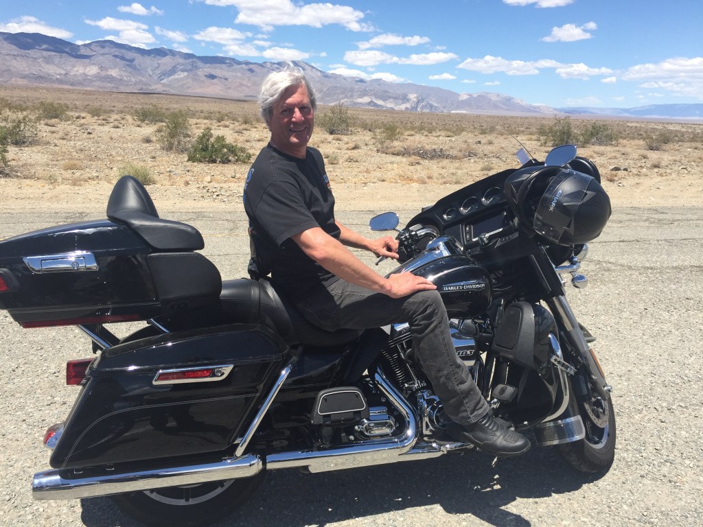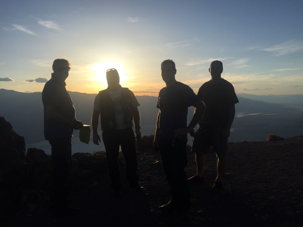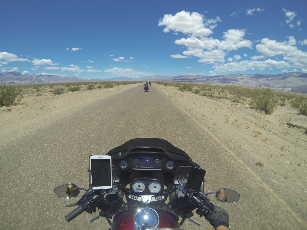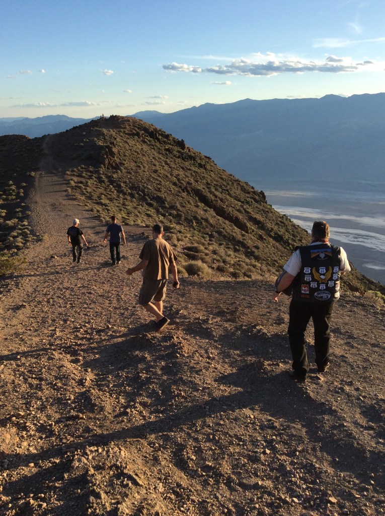 The Foxes now reverted to Desert mode as they entered Searle Valley. Things got tricky. It was a vast open space with large rock mtns painted on the horizon. It was hot & dry. Then a stealth bomber flies over followed by a FA18 which did a very low flight passover which scared us shitless. Desperate for water we stopped at Ballarat to discover it was a ghost town. We are dazed and confused so we pissed on the monument (not a tree to be seen). We pressed on regardless. Then conditions turned against us. The road became thick corrugated sand & gravel. Leaving no man behind we bounced along this track for 2 miles. We were in various degrees of disarray. After regrouping & therapy, the foxes put batteries to power & engines to speed. Time had to be made up. Boxy led us to great heights, about 5000ft, and then straight down to sea level into Death Valley NP. Seriously, people could die here. Unbelievably the road became like the felt on a pool table. We were hot & thirsty & emotional. Hydro suggested a quick frolic in the mesquite sand dunes before reaching our ranch home for the night at Furnace Creek. It should be noted the the financial affairs of the Foxes are well handled by our Treasurer Russ. Another beer please. Checked in & immediately rehydrated with beer at the bar. A couple of hours r&r and then a sunset ride to Dantes View over Badwater flats. Mighty fine country on a warm balmy night. Dinner at the hotel tonight. Las Vegas tomorrow. Bring it on!
