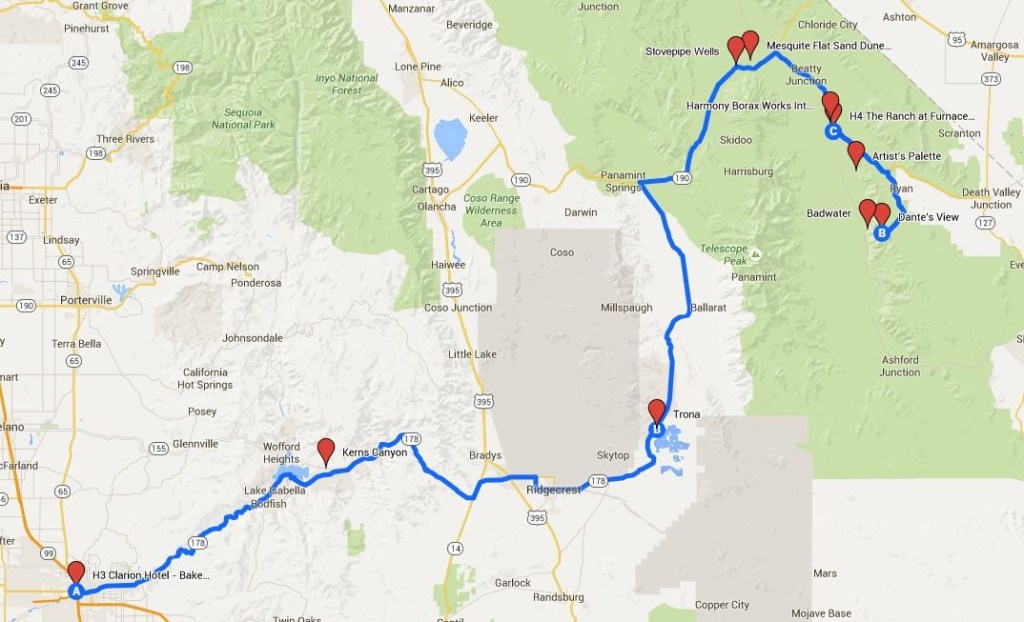 Today we leave Bakersfield on Highway 178 through Kerns Canyon and across the lower part of the Sierras. We then head through Ridgecrest and the US military bases of Trona. When we hit the intersection of Hwy 190 which we follow all the way the Furnace Creek.