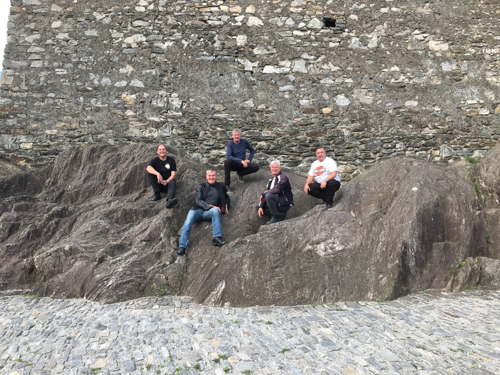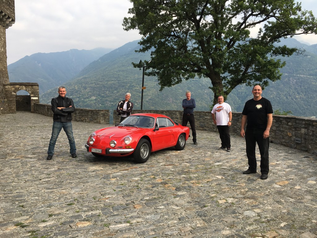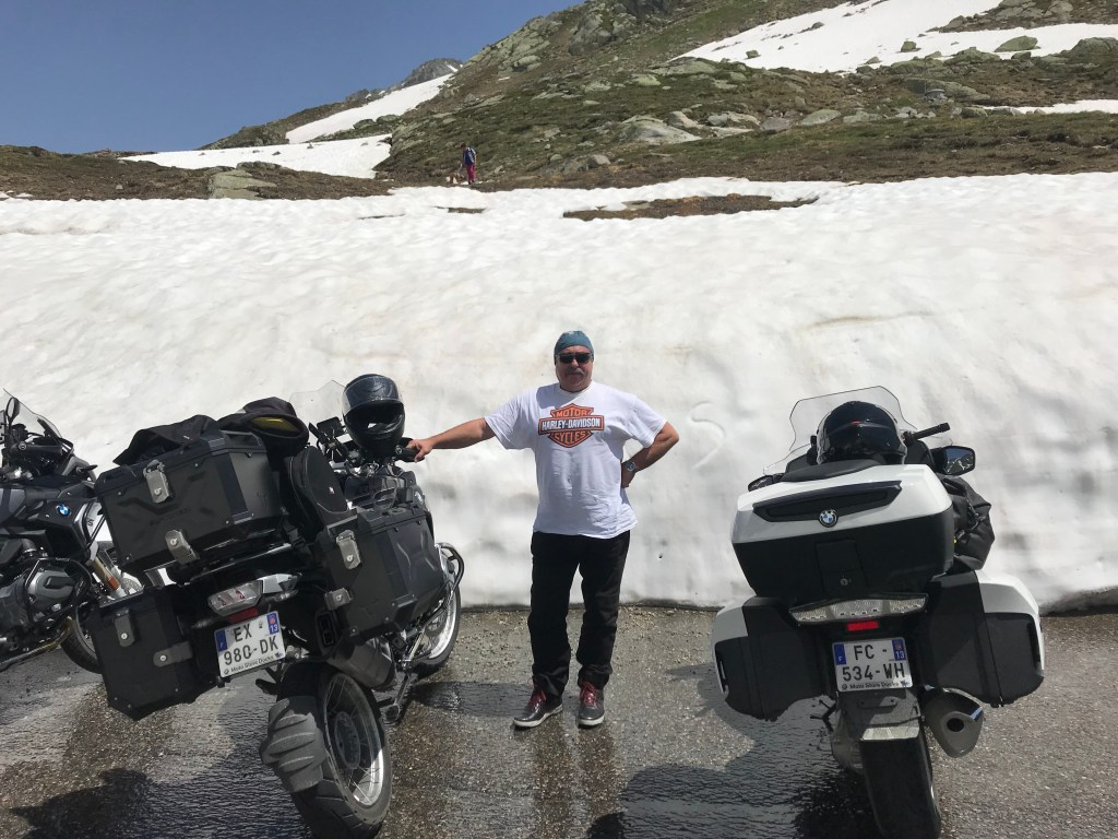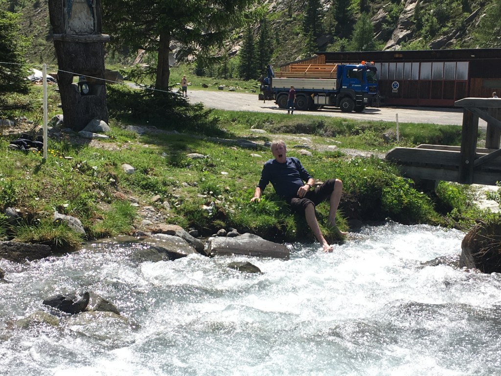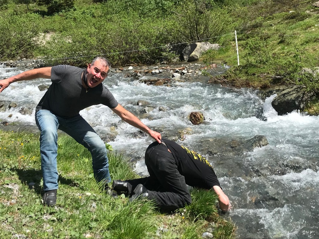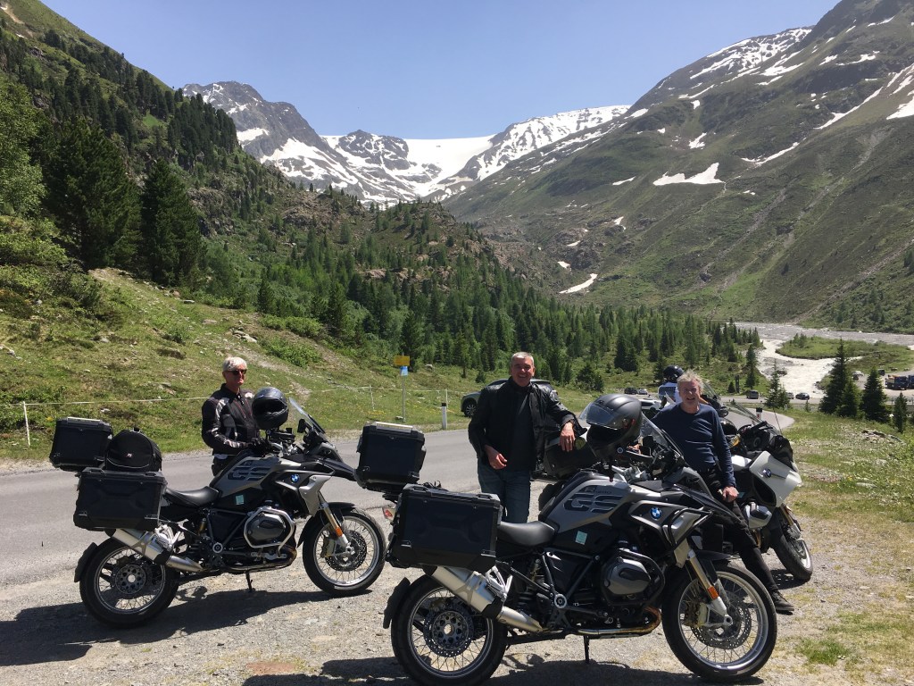We ride to the top of the hill over Chamonix. We lean upon a man with a lovely 1975 Alpine Renault to take some photos at the castle. A great ride through a number of passes this morning on the way to Davos. Tension is high in anticipation of Russ’ address on the state of the economy & the apology to Hydro. Then we were reminded that we are not a support group so the apology was dispensed with. Russ’ address was well received but quietly no one really understood what he said. We carried on to Flüelapass for lunch. 30 degrees in the snow After lunch we took a side trip to Kaunertal, a rollicking helter skelter of a ride along the raging river & then to the top of the mountain. We stopped to take a dip in the glacial river. In the meantime, Boxy’s bike has found another hole and he requires extraction services. Russ & Tony to the rescue while Singo gets the episode on film for future embarrassing stories. Time to head for Solden. We are met by Karl at the hotel who proffers 5 shot glasses & honey/apple schnapps. Singo & Boxy sharing a room tonight cos they have something in common – snoring! Into town for a few wines by the river & a Weiner Schnitzel. Austria is a place of reserved behaviours. Clearly, Tony doesn’t get it, choosing to mount a child’s crocodile at the pub! Today was a brilliant day. We’ve discarded the heavy jackets & riding in T-shirt’s. Scenery amazing, particularly the young girls raking up the cut grass in bikinis. Sadly, their mothers were doing the same thing.