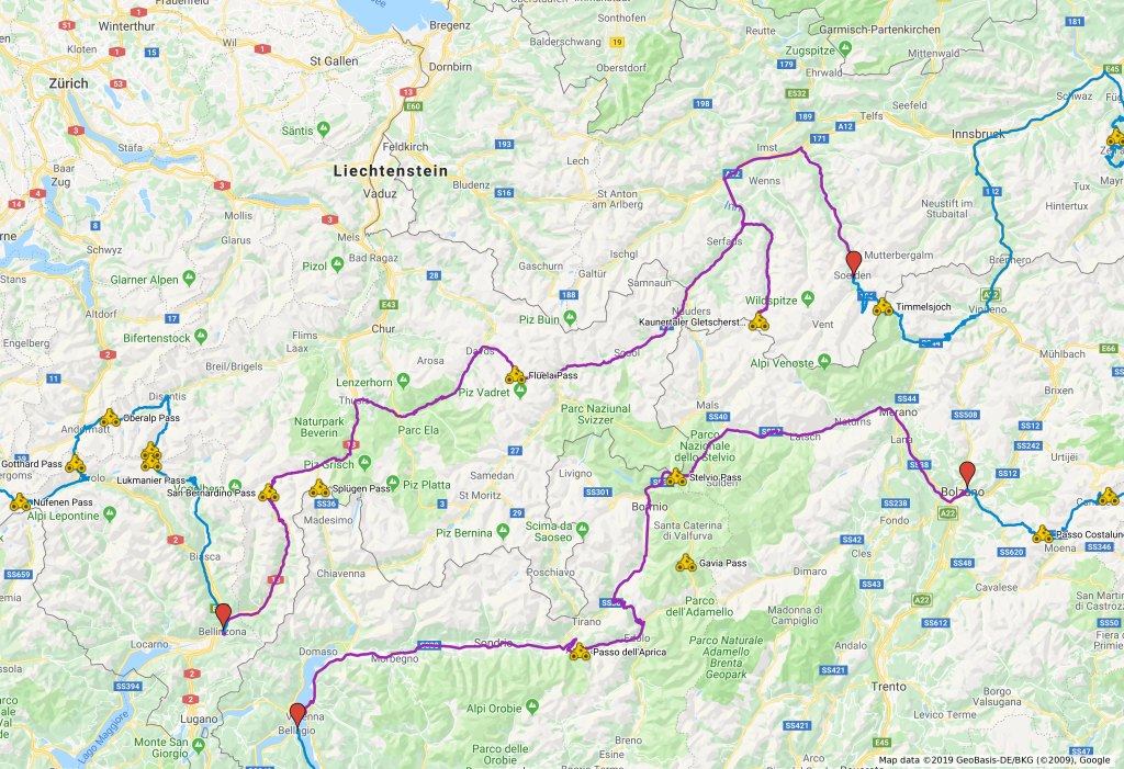 Setting off from Bellinzona, we’ll head through the San Bernadino Pass in Switzerland, then the Splugen Pass crossing into Italy, and then back into Switzerland to the Majola Pass, Silvretta Alps, and then into Austria to Sölden via side trip to Kaunertal glacier. Sölden is an Alpine resort in the Ötztal Valley, in the Austrian state of Tyrol.