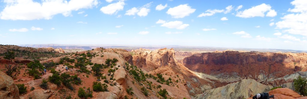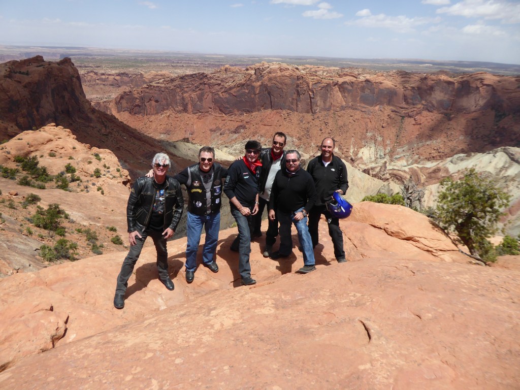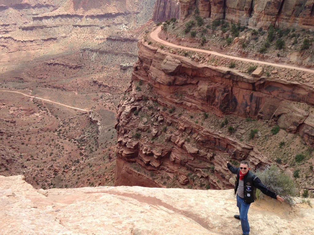 We left Bluff (in the Navajo Nation, Utah) and after an hour we were at 6000ft & freezing. Arrived at Monticello. Boxy swears he saw 5 deer cross the main road as he was doing doughnuts in the Main Street. No one else saw a thing. Cold obviously getting to him. Encouraging him inside, we had our first real coffee in days. We re-fuelled and bought enough hand warmers to last winter. Then to Moab by 10am, our destination for the day (still in Utah). Time to hit a few NP’s. First attraction is ‘Island in the Sky’ in Canyonlands NP, a magnificent plateau cut out by Green River & the Upper Colorado. At 5500ft.Then onto the Uplift Dome, a crater. Very deep and caused by a meteorite. We had to walk 0.3miles (it was a very steep hill).
