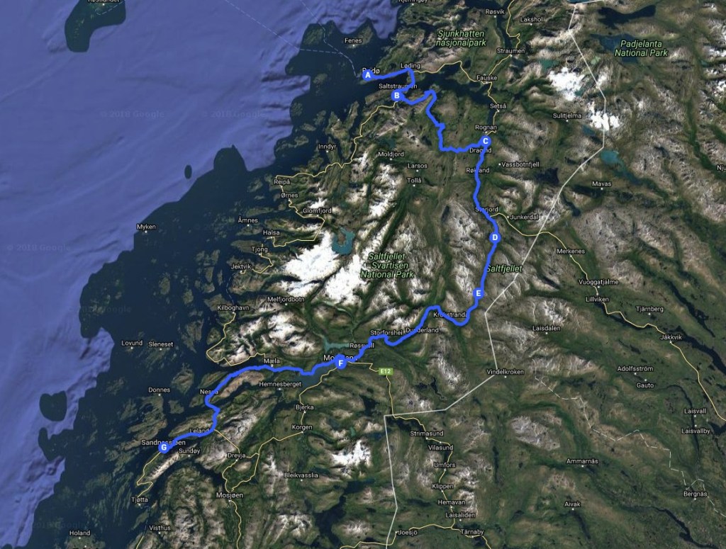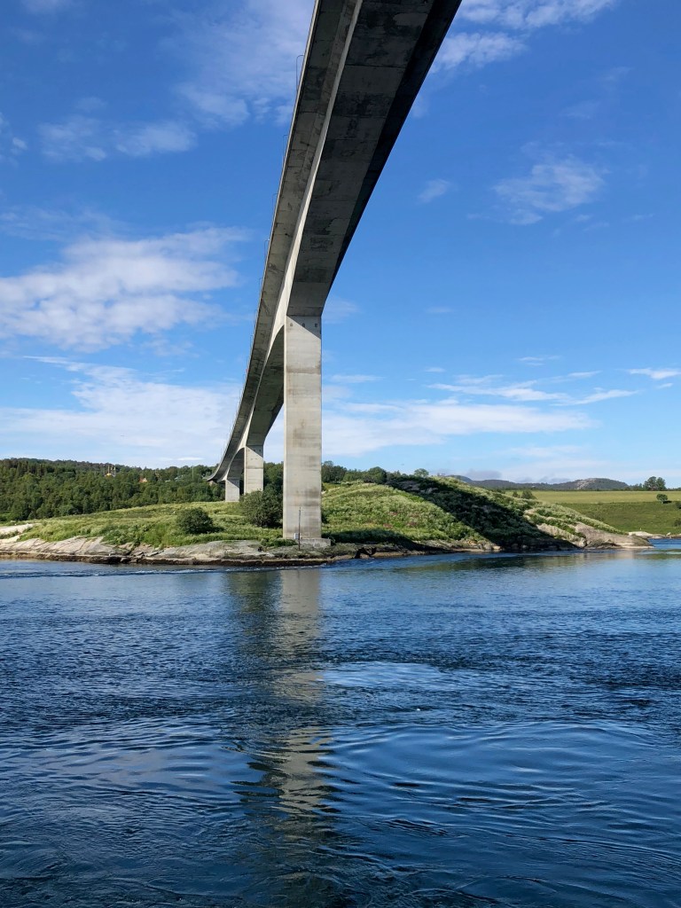 This afternoon we head back down to the rural valleys, pine trees lining the rivers. Only irritant is the roadworks & slow traffic from time to time. Ferry back to the mainland, Nesna to Levang. A group of elderly but well heeled Italians hustle us in the queue. Russ steps up and speaks to them in his best Italian. Consequently they push straight to the front! Russ has been dropped from the “Cultural Relations and Promotions (CRAP) Committee.” After disembarking, we cross an amazing steel structure and into Sandnessjoen for the night. Dinner at the hotel and watch England get beaten by Croatia. We have taken up poll position which requires those staying at the hotel to walk between us and the TV. We experimented with psychology 101. Clap those who duck in front of tv & razz those who don’t. Also a good way to work out who you’d like to hang out with! The women appear to have much better personalities than the men.