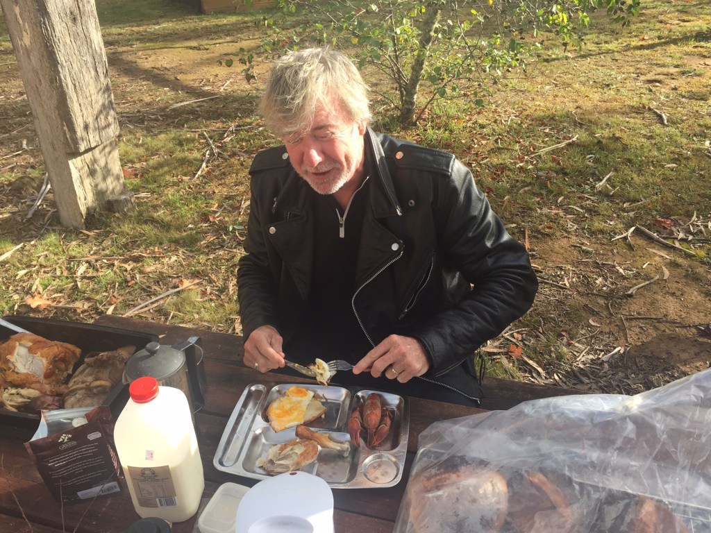At the completion of a fine meal Karen & Steve took us back to the convention centre where the bread makers were waiting for us with the fire roaring and the drinks flowing. We enjoyed a few drinks and chat around the fire and were concerned but not surprised when Gibbo fell to the deck. A quick check to see that he was breathing and we continued our stories while he made a bed for himself amongst the leaves.