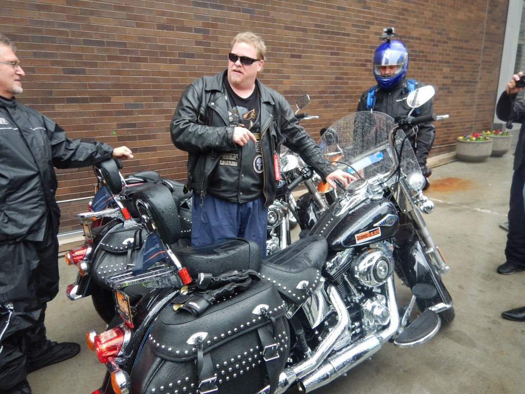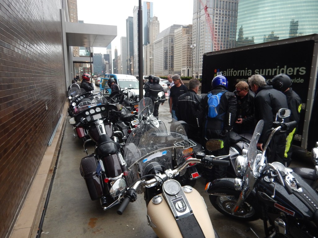 We dutifully rose and packed, meeting downstairs at 8am. With close attention to the radar (Hydro loves this crap) we sat and waited. Behold, the rain stopped and we prepared to leave about 10.30. Wet weather gear on! Bikes started and we moved off – no one stalled or dropped it! The going was slow out of Chicago and made more difficult cos we didn’t know the road rules. Ah, wise heads prevail.