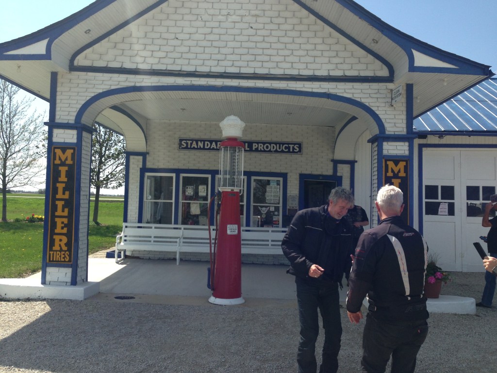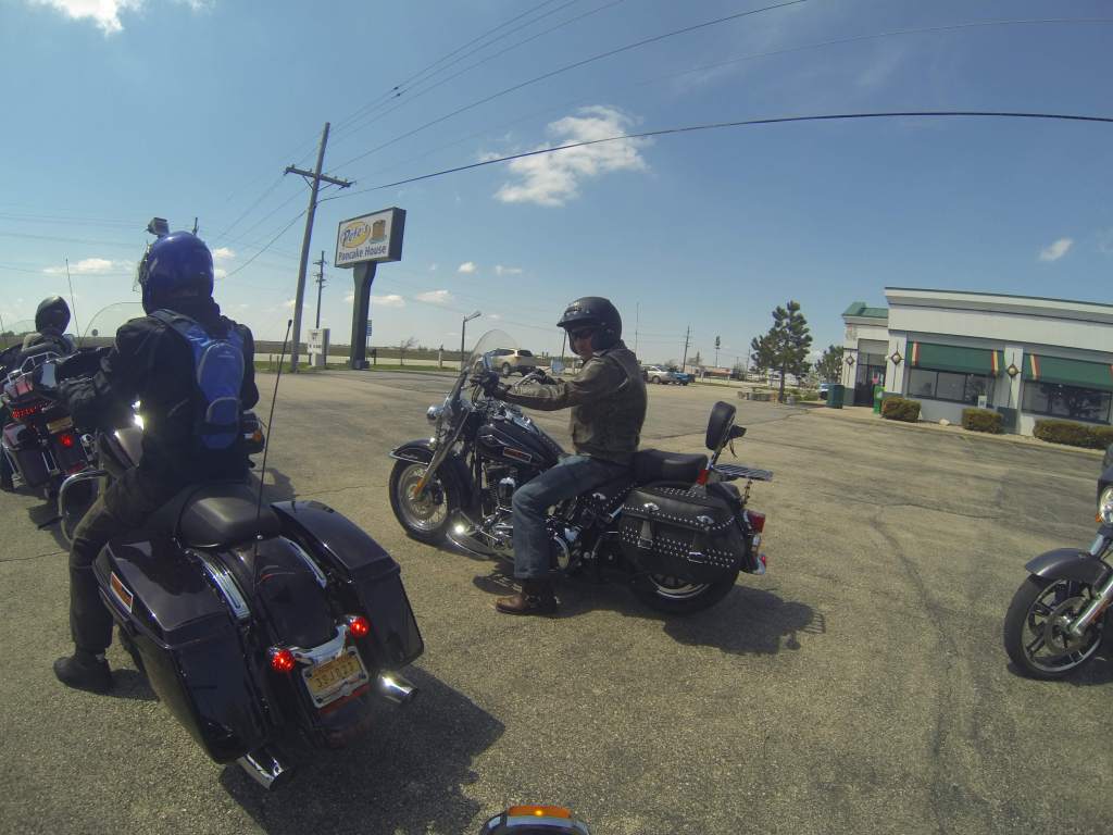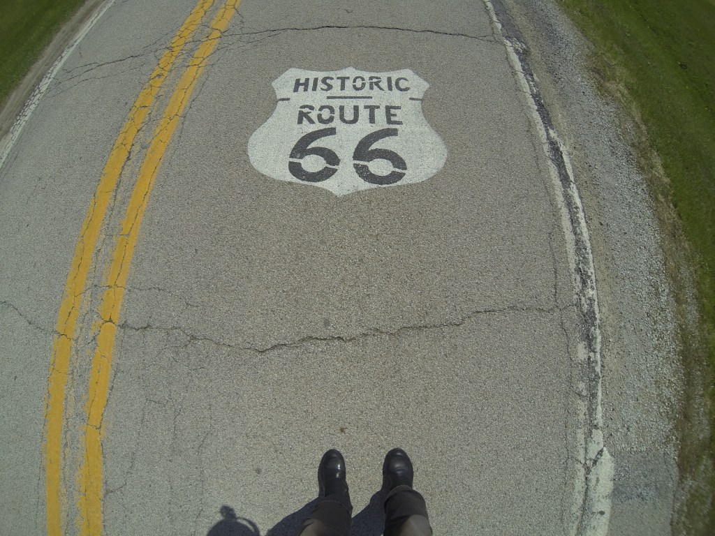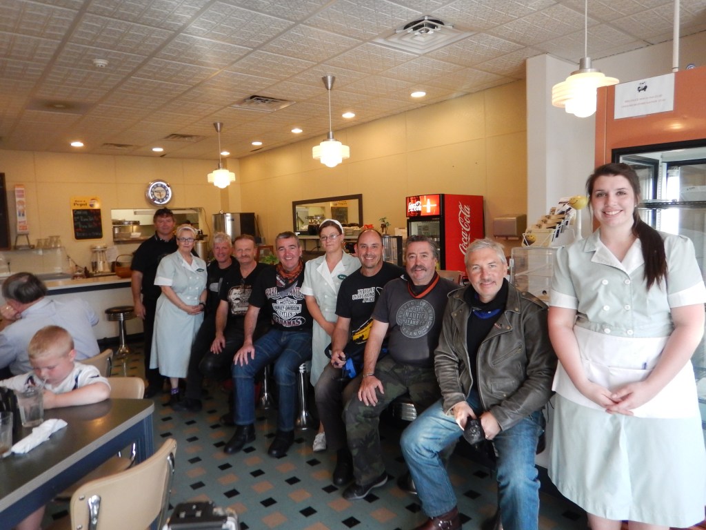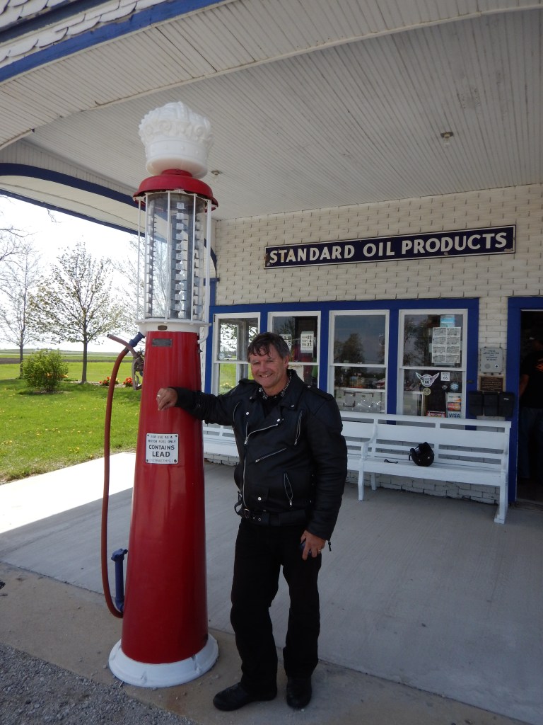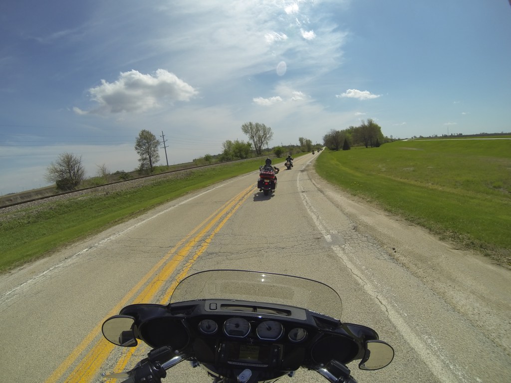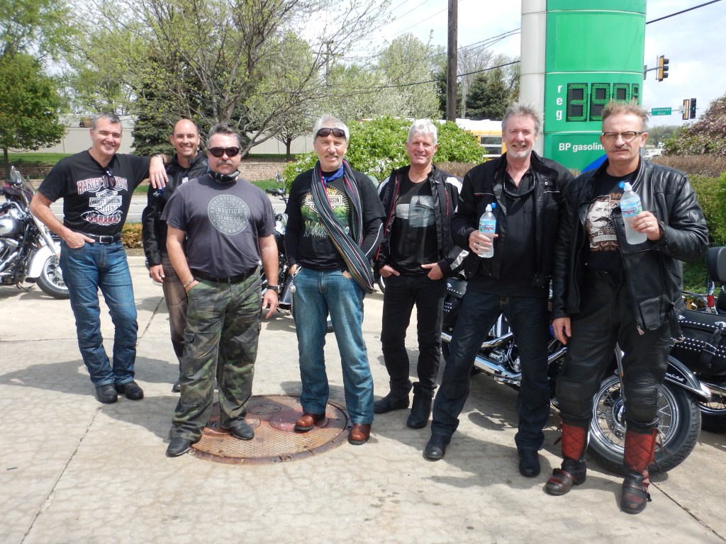 We passed the starting point of Route 66 on Adams Street and headed off down the highway, south of Chicago (lives a man named Leroy Brown). After an hour we pulled over and removed the wet weather gear. Skies clearing. Leader Gary (“Bear”) tells us our riding formation is crap. Bring it in close boys and stagger formation. Righto then.