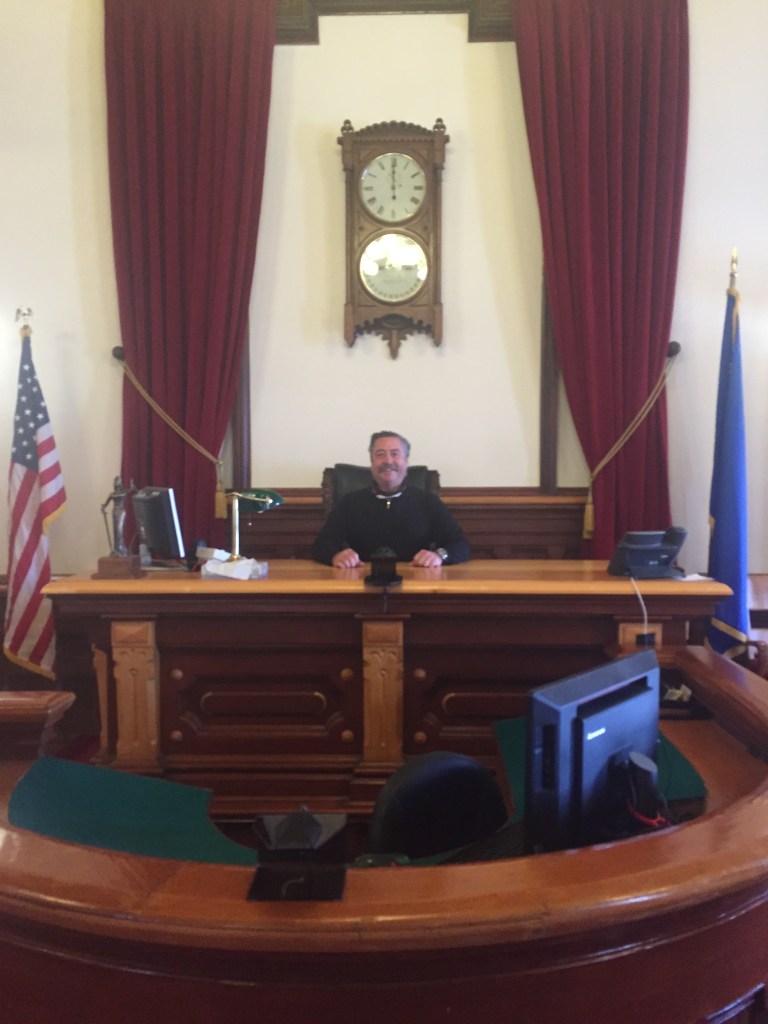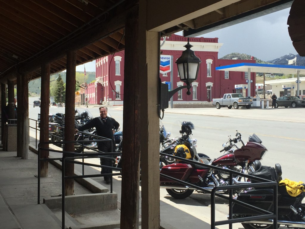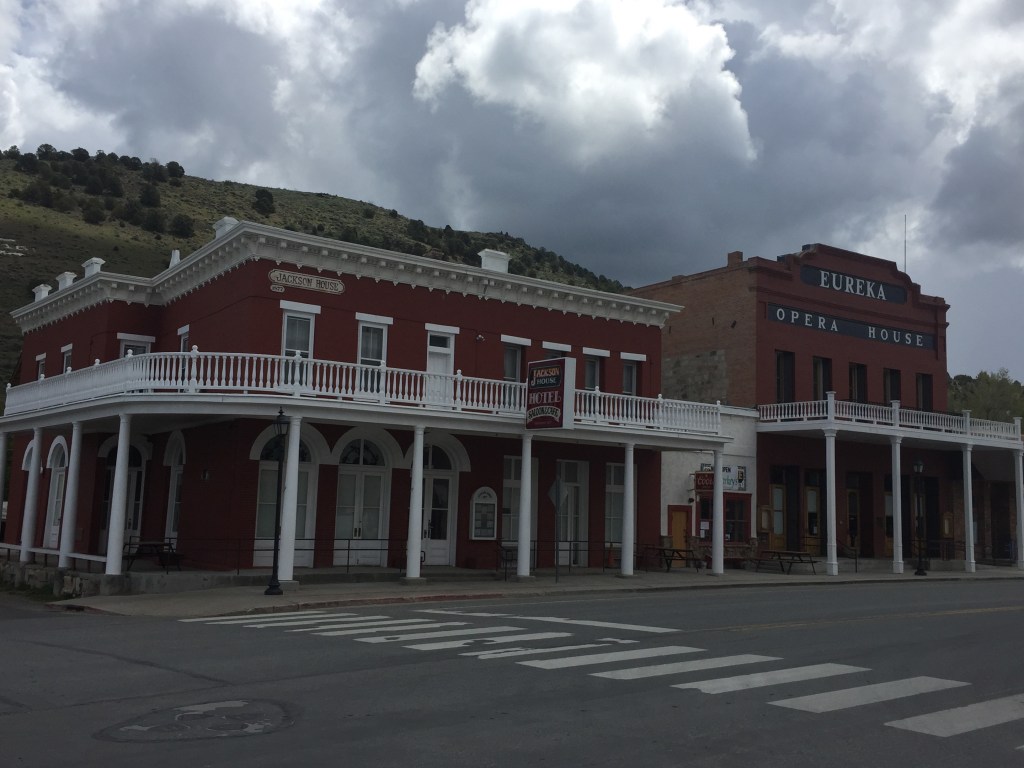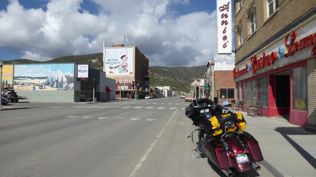 Left Ely at a luxurious 9am. Cool but clear conditions. We are on Hwy 50 (the loneliest road in America) all day. Much has been written about this road so not quite sure what to expect. Off we go with full tanks. First stop for the day is Eureka, 80 miles on. The scenery is more of yesterday. Summits, basins, green bushy vegetation and rain always threatening. Unbelievably, the road winds between the rain squalls which are sitting over the snow capped mountains. Boxy led us off the road into quicksand for a quick change into wet gear at one stage! Eureka is a mid-19th century silver mining town. We have a coffee & soup in a western bar and then up to the working courthouse for a look. We walk straight into the open Court Room and pretend we are playing Boston Legal. Judge Box hands down a judgement that Singo’s reporting in this blog is slanted in his favour. Singo fronts the press and states, “of course, I’m not an idiot!”