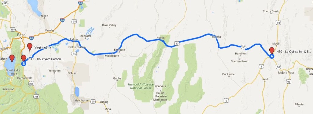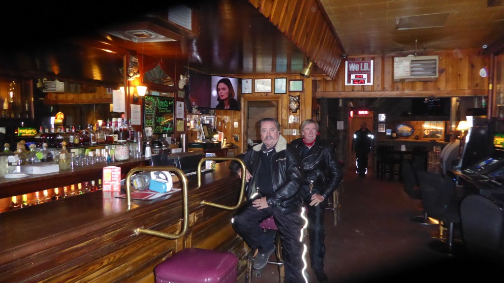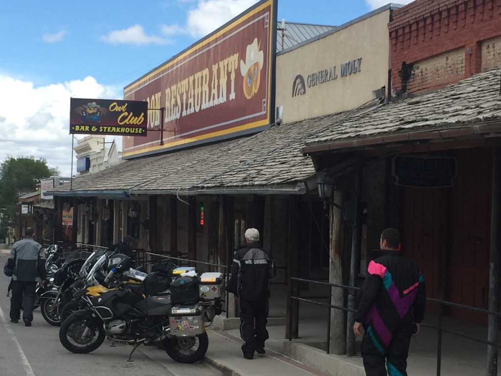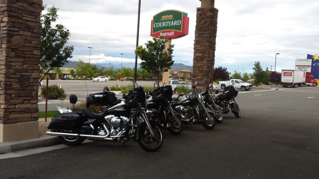 Next stop is Austin, another 70 miles on. Time for lunch. From here we hit out for Carson City like men possessed (ghost riders in the sky). The rain squalls were threatening and sometimes getting us. Mike was in and out of his multi coloured jumpsuit more times than Katy Perry and Singo produced the yellow raincoat he kept from kindergarten. We looked like really tough bikies! Bikies going the other way stopped responding to our signaling. Back to black! We passed a sign requesting that we report any shooting from the highway. We couldn’t see the number cos it was shot to pieces. We miraculously survived Hwy 50 arriving into Carson City about 5pm. After a big day in the saddle, we settled into a few wines at the bar before moving on to the local steakhouse which is at the back of the casino. But it is magnificent fine dining. The Foxes are in good form and the meal is great. Red wine of choice is Lido Bay. Boxy issues instructions to the staff on how to make an Affigato. I think we are starting to celebrate the finish line!