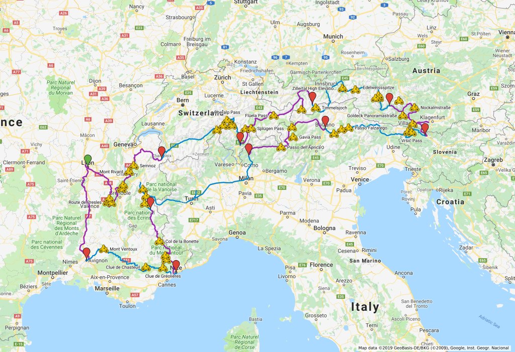 This was one of our best touring rides that took in France, Switzerland, Austria, Slovenia and Italy. The distance covered was 4,300km over 11 days, with vertical climbs and descents amounting to 77kms encompassed in over 70 passes. It was a test of endurance and if we had our time again would have put a rest day in, however that did not detract from a spectacular ride.