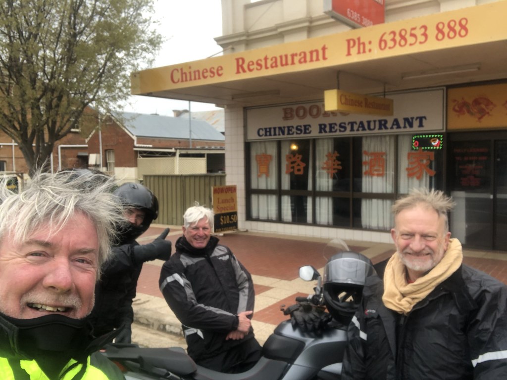 The Bundanoon Boys (“stand back and stand by”) head to Heatherbrae pie shop to eat and await the arrival of Lewy & Richo. By their reporting, they left Sydney at 7.30 in windy cold conditions. They arrive at 9.04 & their tardiness is noted. Richo submits that 70kmh cross winds hampered their progress. A quick meeting of the Star Chamber handed down the following finding, “Then you should have been aware and left earlier??” Down motorway and turnoff to Goulburn and then to Crookwell. We passed adjacent to the wind farm – they are huge. We are crook in Crookwell! It’s snowing and it’s cold. Warm up and wet weather gear in the coffee shop. Next stop Boorowa. Russ leads the charge at a sedate pace on wet roads. Behold the rain gone & we notice that it got warmer. Stretch the legs and we are off to Young. Lewy recommends we don’t fill up ‘cos a drovers dog could get to Young. Well Richo is no drovers dog. As we approached Young, Andy pulls over and smiles helplessly as we drive past. He’s out of Gas and hasn’t indicated using the Boxy code. Singo offers a tow but the group confer & decide this can only be a disaster. So we wish him the best on his 60th and drive off. Pete, who takes his role as sweeper very seriously, lingers to push him to the hill & Andy cruised in to town. All good. Lunch at the Australia Hotel. Young to Grenfell (Lawsons birth Place), a lovely town past it’s used by date. To Warraderry and onto Forbes. The ride today was spectacular. The country is green, wheat is knee high, the sheep & cows are fat. The flowers are out and it looks great. Patterson’s curse & canola is everywhere. The Foxes are in great form. Richo is 60 and riding a new Indian (with matching riding gear). Andy G is leading from the front. Our route is etched on a piece of bark he marked “with a thumb nail dipped in tar”. Hydro where are you!! The abridged plan is not wholly adequate but Russ is riding as back up with technology. Pete is kitted up in double denim and riding proudly astride the palamino. He is playing sweeper at the back of the pack. Russ is moving easily between frontman & leisurely meandering toward the back. He is lurking around Andy G to make sure we are on track following his occasional lapses. Singo generally riding at 2 or 3, thinking about how he can humiliate his fellow riders in this blog. Accommodation at the Town & Country Forbes which backs onto the golf club where we have our first beer. Pizza dinner at nearby restaurant tonight.
