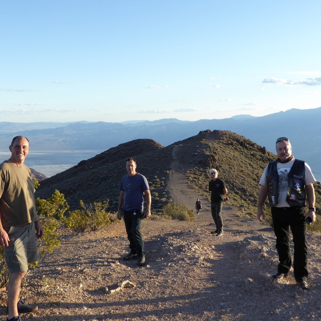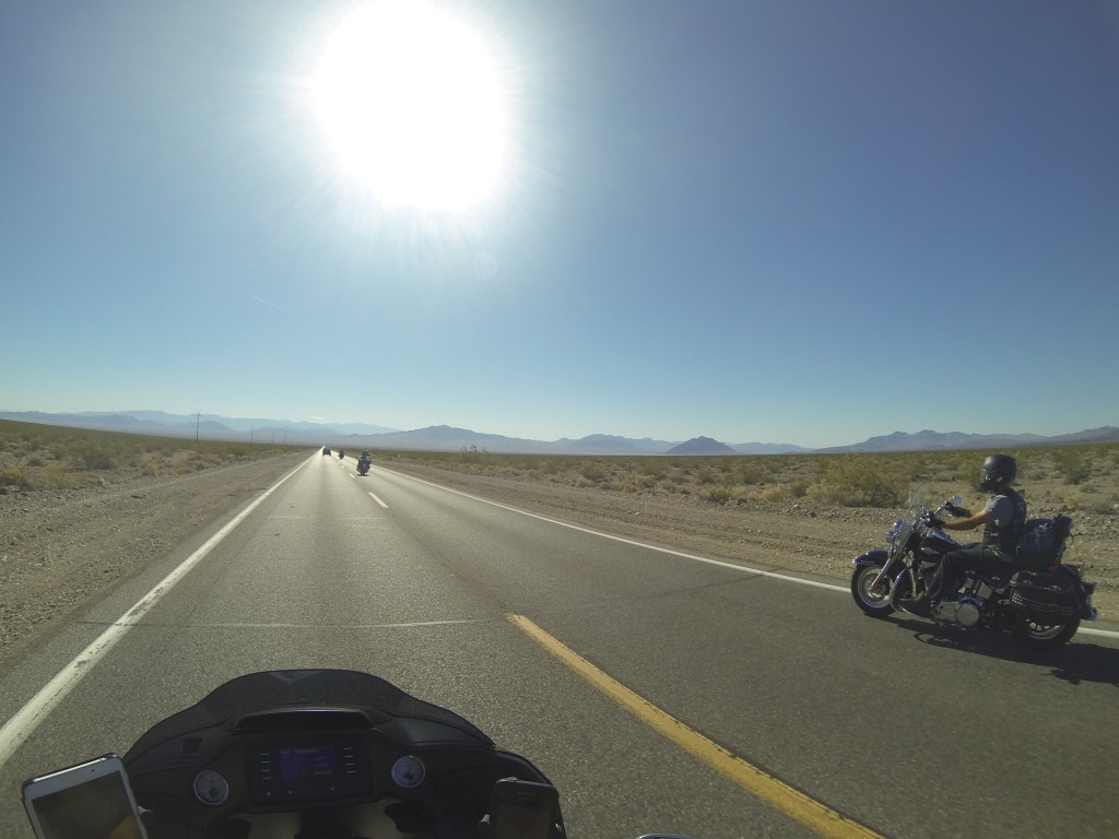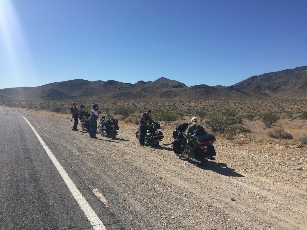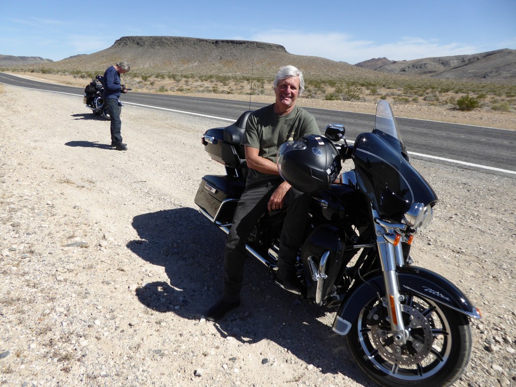 About 140 miles today. We took off early. Singo on a mission and led the Foxes across the desert. Sadly they failed to respond to the ‘moderate’ pace being set. A rev up at the first drinks brake failed to revive their spirits. It was hot & dry, Hydro’s ‘Desert Air & Precipitation Meter’ registering 100deg. We dawdled towards LV at pedestrian speed. “We just want to enjoy the view!” They said. But it doesn’t change in the desert whatever speed you do! Anyway we moved on and entered the outskirts of Las Vegas & with some chaotic lane changes arrived at the Tropicana about 11am. Russ parked his bike in the orthodox way today.