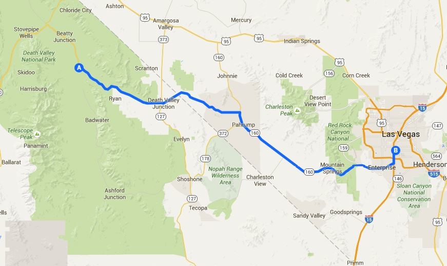 Short trip today. We leave Furnace Creek on Highway 190 East and then turn right onto Highway 160 towards Shoshone and Parump, Continue on Highway 160 which will connect with Interstate 15 and bring you into Las Vegas.