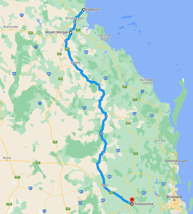 Day 43 30/5/22 Yepoon to Toowoomba via Zilzie and Mt Morgan 720kms