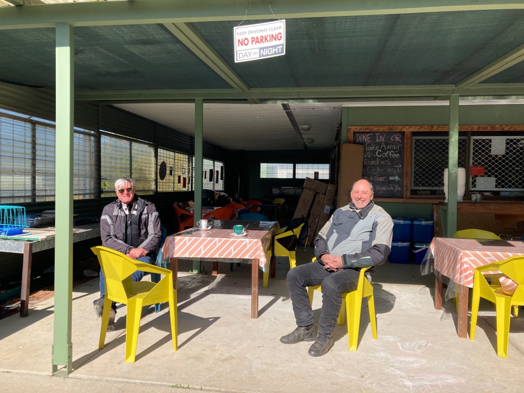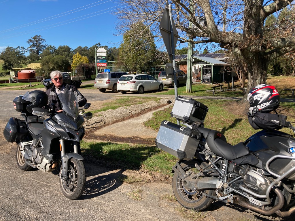 Woke up and the temperature was minus 2, with ice on the bikes…(well Hydros anyway, Russ parked undercover). The meeting time of 7.30 passed by with no sign of Hydro. Usually by this time he had already done two laps around town and bought his second coffee. Russ was suspecting he might have had a night on the stillnox. At 8 he emerged having slept on his phone and not heard the alarm. Scraped the ice off the bikes and cruised into Uralla at sub zero temps for breakfast at “The Alternative Root Cafe” a fox hangout on previous trips.