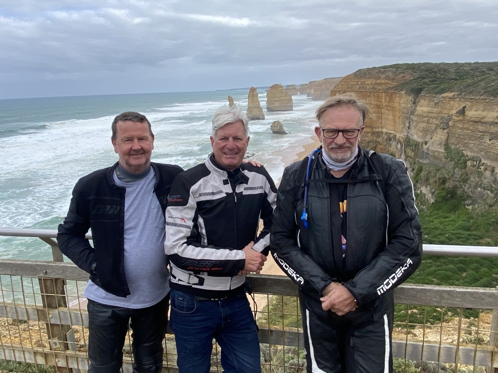 On the road by 9 and a spectacular ride down the Great Ocean road. It was about 9 degrees and bracing for Kevinn and Gibbo, but Russ had his electric jacket on and was, well, toasty. First stop Gibsons steps. Russ ran down to the beach but Gibbo and Kev watched from the top, as they had to preserve their knees for less frivolous activities. Then the requisite photos were taken at the 12 apostles where we were accosted by all the people we overtook on the way to get there….how do these people recognise us?