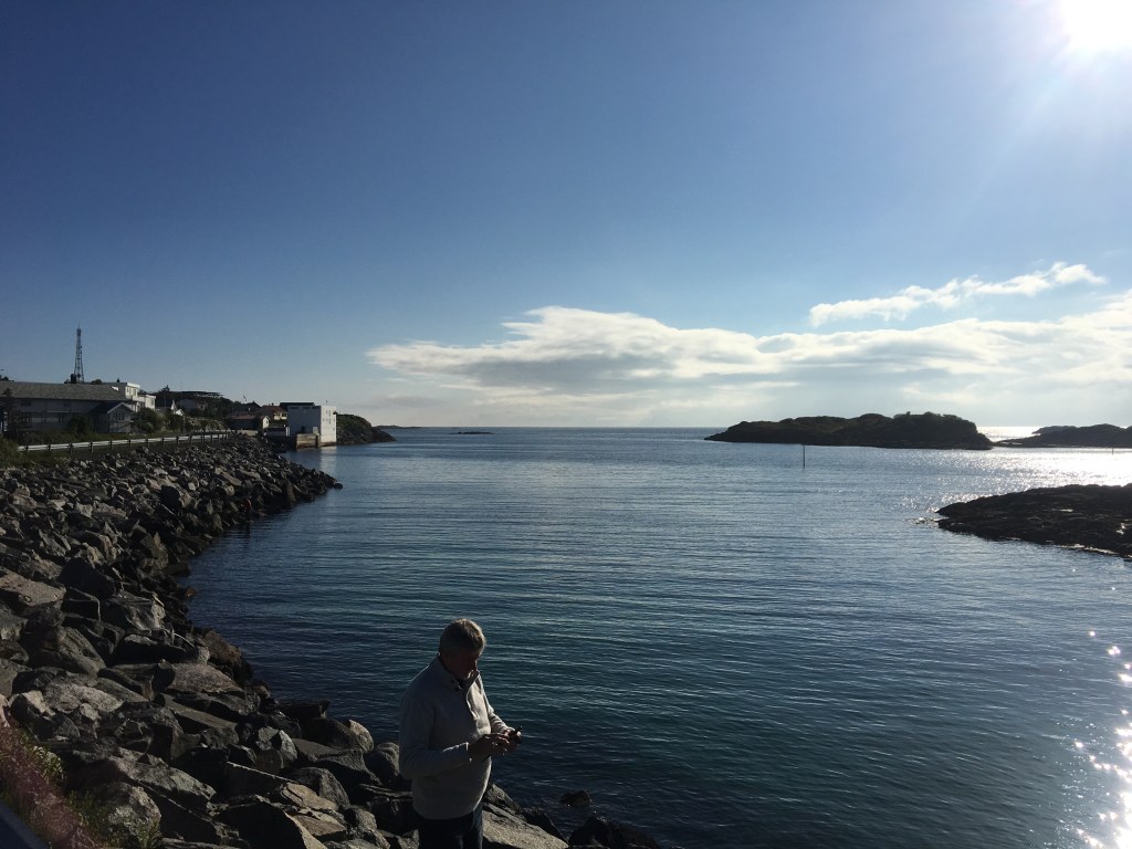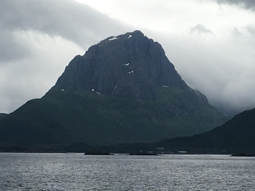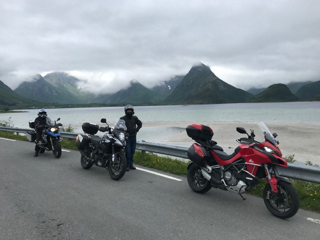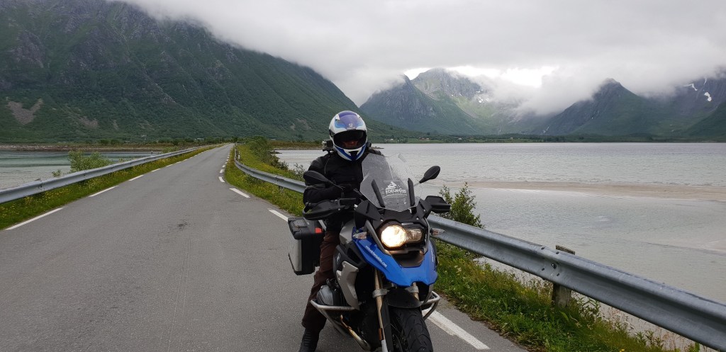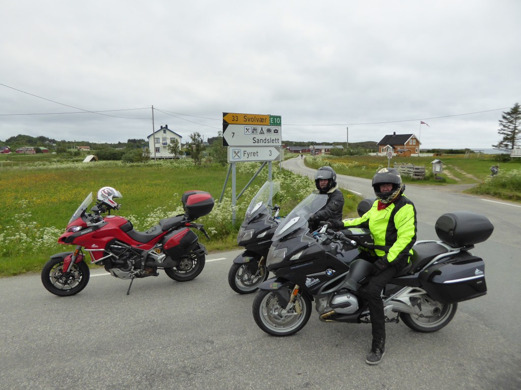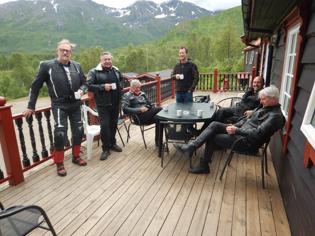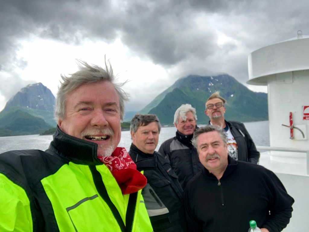 Gibbo very disappointed as he wanted to recreate “Turn Back Time” (was prepared with stockings & bodice). Dare I say we were very grateful. Rode off across the top of Norway, overtaking, stopping, overtaking the same vehicles again. A bit messy this morning. We left in hot weather but it’s now turned again. At Melbu…..we turned left & drove straight into the mouth of a ferry. Was this in the plan? Pork Polse (hot dog) for lunch on board. We did a 25 minute trip to “Skull Island”. It was the most evil looking place. Huge dark rock towering above thick floating cloud. It looked like we had been brought here to die. We rode for 50kms around this deserted island, through a village called ‘Dunnfor’, not a good omen, until behold, an oasis, Svolvaer. You won’t believe who’s there…..yep Lizi. There is a local town market, jumpers being the specialty. Lewy does a selfie & sends to Janelle for approval. (30kms later after arriving at our Hotel, Lewy remounts & drives back to buy the jumper. The approval had finally come through!)Coffee & patches for our vests & we head off to our Hotel in Henningsvaer. The road around this island, one of the Lofoten Islands, is very picturesque. Thousands of rocks lying off the coast. The low hanging cloud and streaks of sunlight give a mystical look. We feel like we are at the top of the world (or in Jurassic Park).Our hotel is situated on the water. Time for a G&T!! Hours to fill in so lots of stories & joking. We wander the town before dinner. It’s a quaint little seaside village. Wonderful hotel and nice dinner. Domenico has embraced our Facebook page.