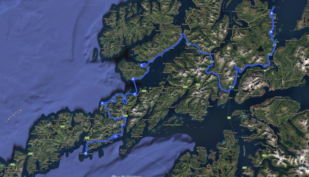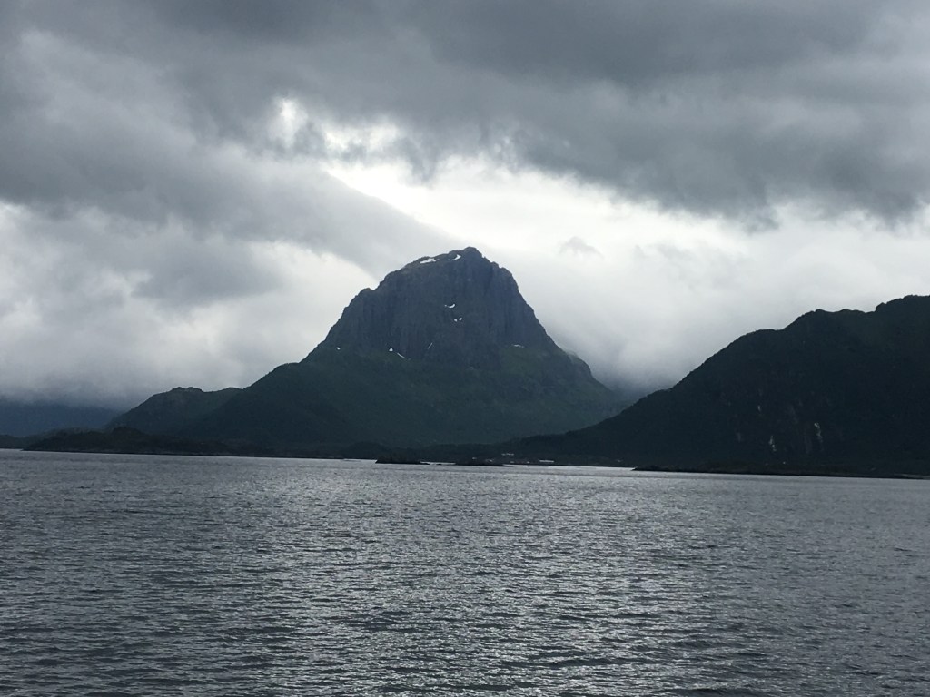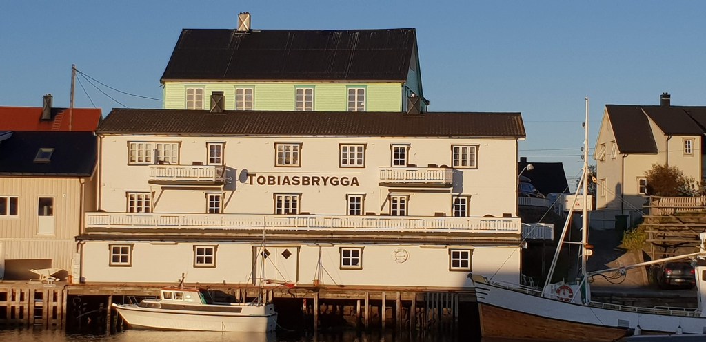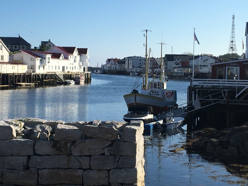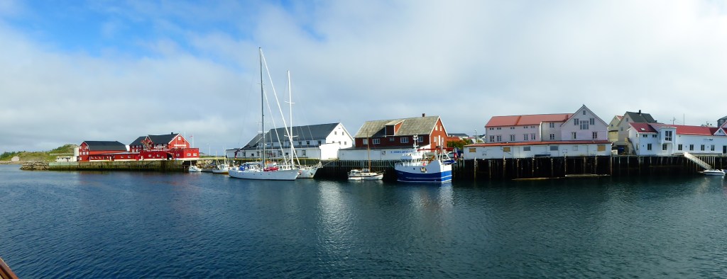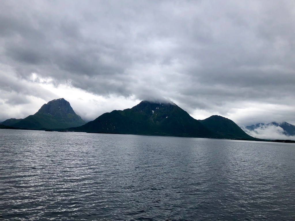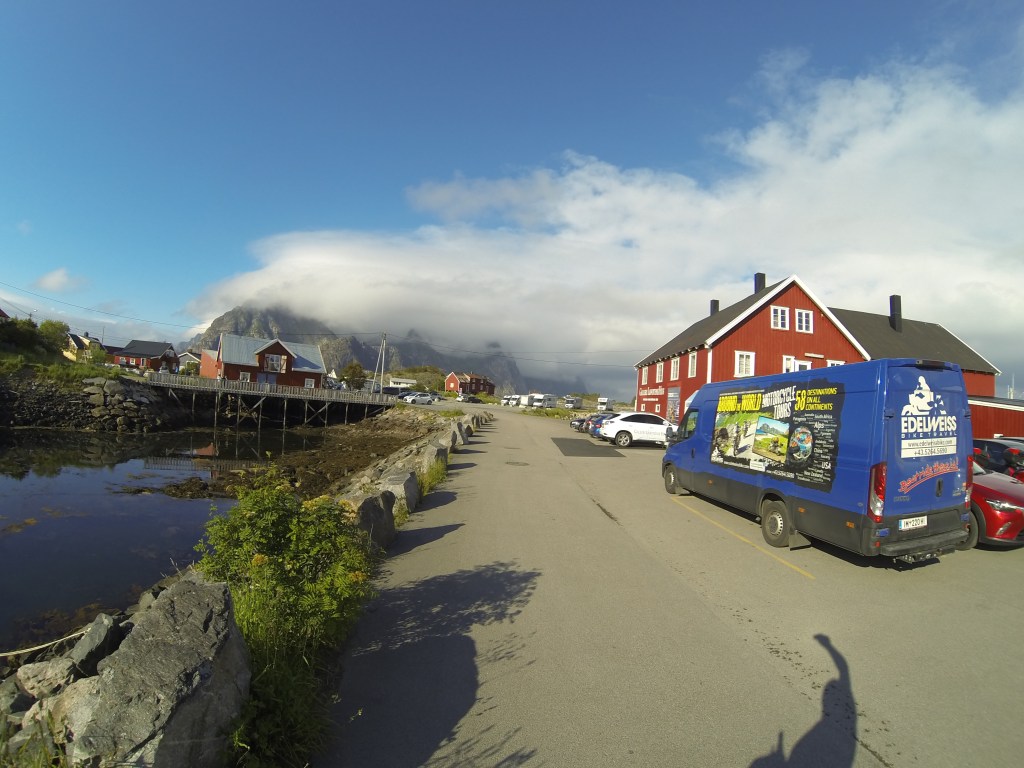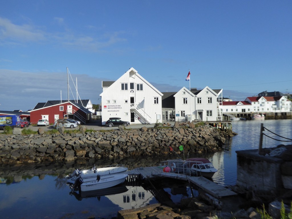 Gibbo very disappointed as he wanted to recreate “Turn Back Time” (was prepared with stockings & bodice). Dare I say we were very grateful. Rode off across the top of Norway, overtaking, stopping, overtaking the same vehicles again. A bit messy this morning. We left in hot weather but it’s now turned again. At Melbu…..we turned left & drove straight into the mouth of a ferry. Was this in the plan? Pork Polse (hot dog) for lunch on board. We did a 25 minute trip to “Skull Island”. It was the most evil looking place. Huge dark rock towering above thick floating cloud. It looked like we had been brought here to die. We rode for 50kms around this deserted island, through a village called ‘Dunnfor’, not a good omen, until behold, an oasis, Svolvaer. You won’t believe who’s there…..yep Lizi. There is a local town market, jumpers being the specialty. Lewy does a selfie & sends to Janelle for approval. (30kms later after arriving at our Hotel, Lewy remounts & drives back to buy the jumper. The approval had finally come through!)Coffee & patches for our vests & we head off to our Hotel in Henningsvaer. The road around this island, one of the Lofoten Islands, is very picturesque. Thousands of rocks lying off the coast. The low hanging cloud and streaks of sunlight give a mystical look. We feel like we are at the top of the world (or in Jurassic Park).Our hotel is situated on the water. Time for a G&T!! Hours to fill in so lots of stories & joking. We wander the town before dinner. It’s a quaint little seaside village. Wonderful hotel and nice dinner. Domenico has embraced our Facebook page.
