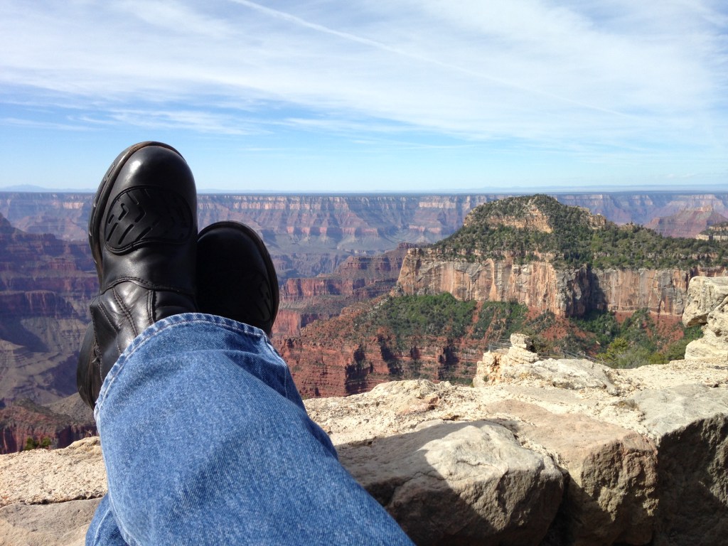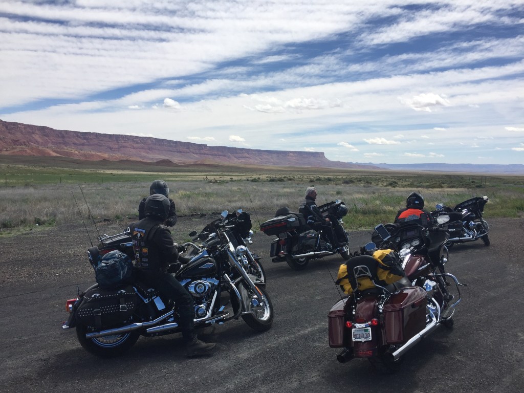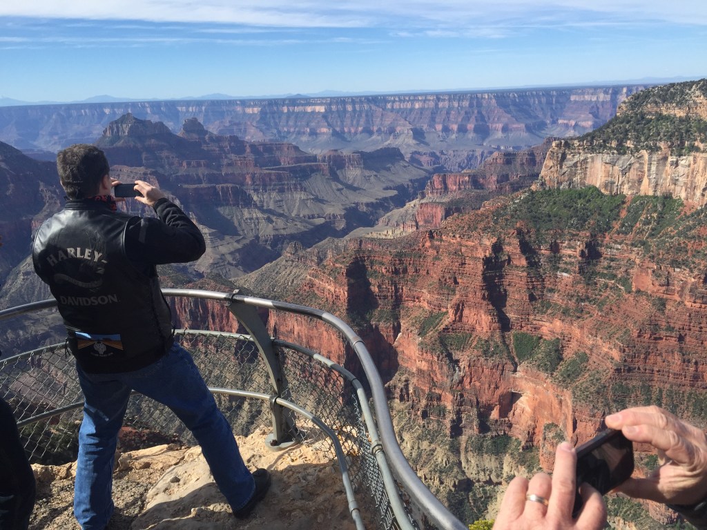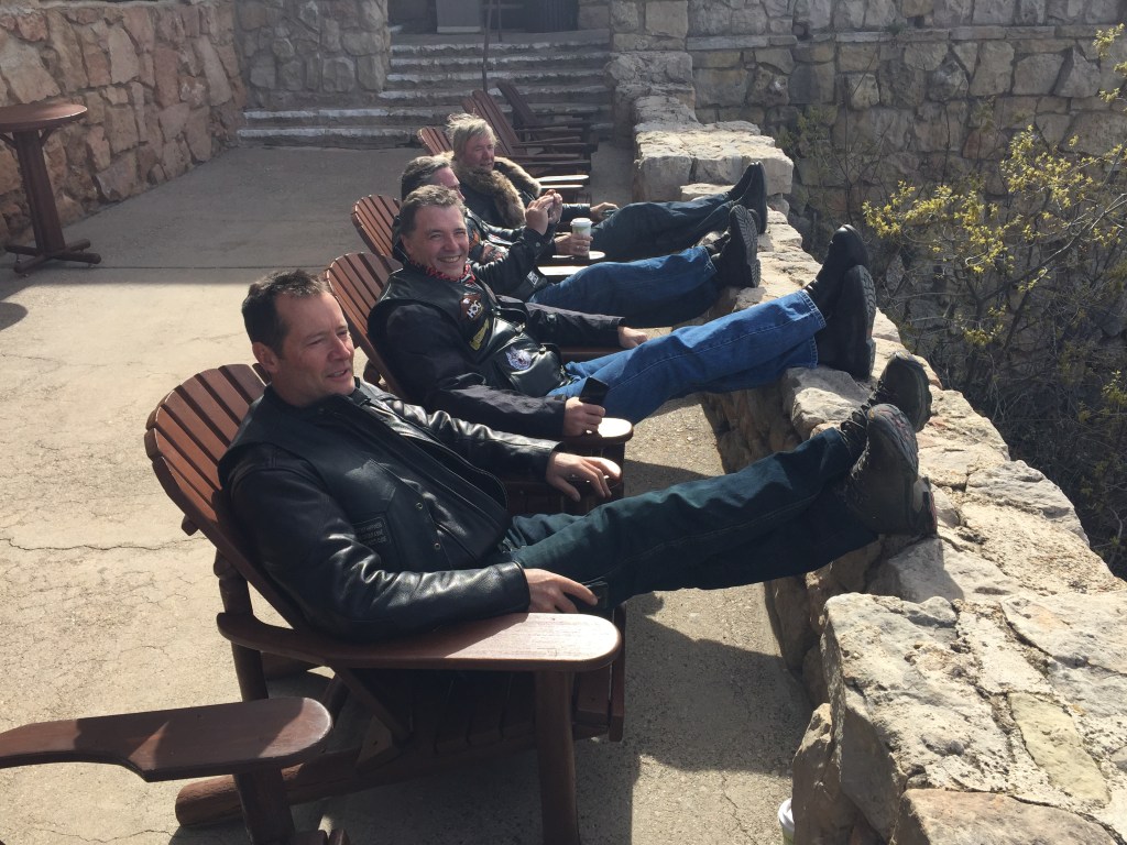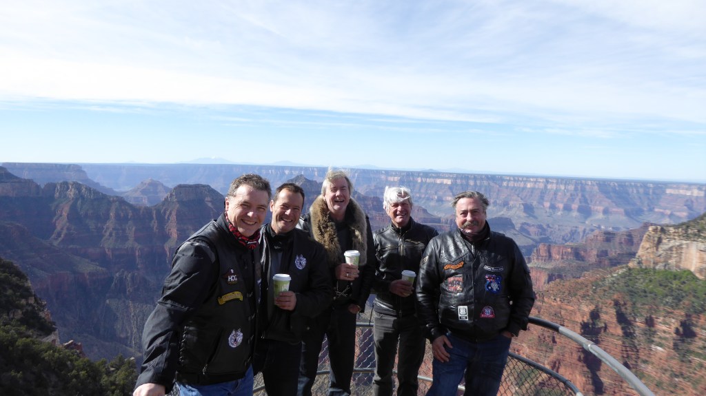 A big day in the saddle so a 7am start. Rider meeting this morning where Hydro excitedly told us that the first stop was a side trip to the North rim of the Grand Canyon. “We ride through lovely meadows and forests”. It went downhill from there. We rode through cold, windy conditions up to 8,800ft. We are totally unprepared! Russ’ top box lid flies like a spinnaker dragging him to the other side of the road. We saw some deer eating grass so we honked them to get some action. Nothing. Our pace is frantic as we determine to reach the canyon!