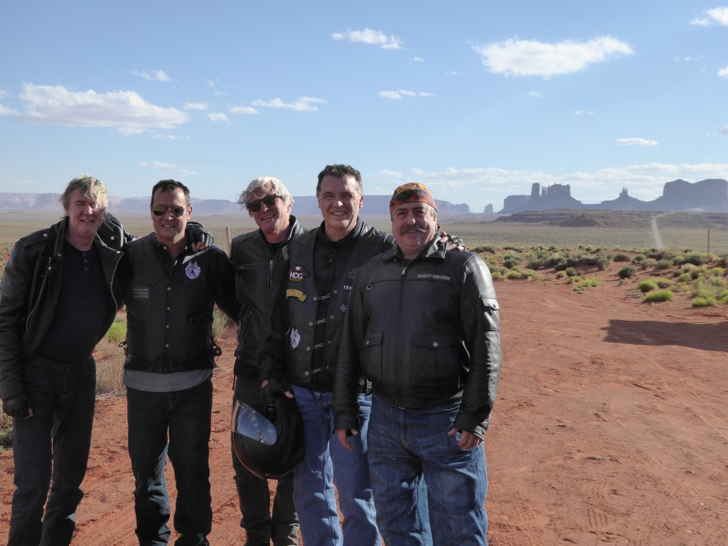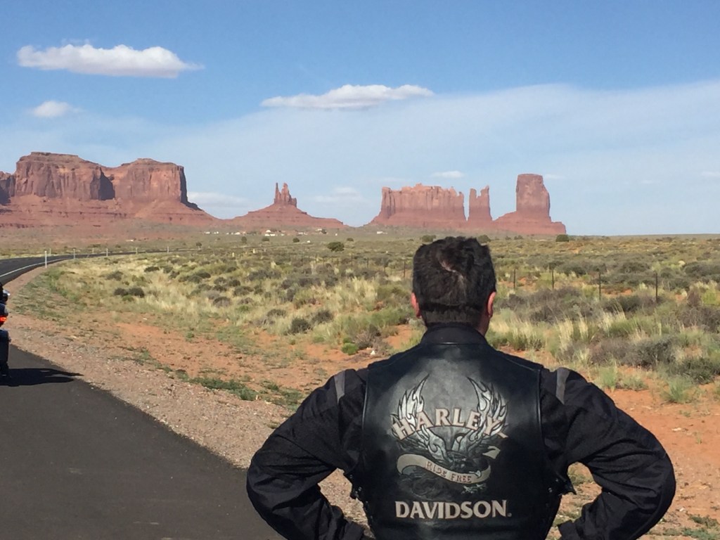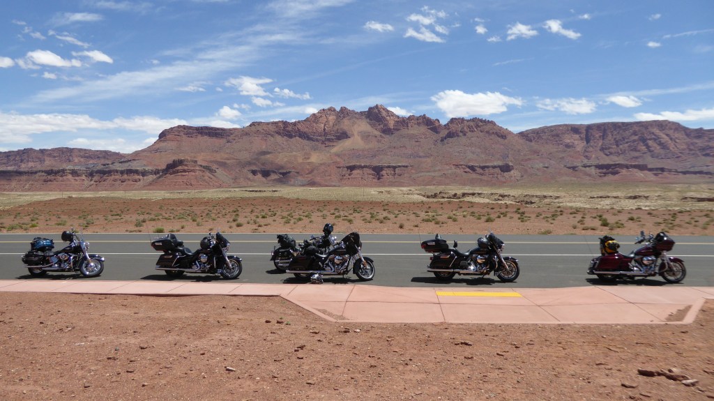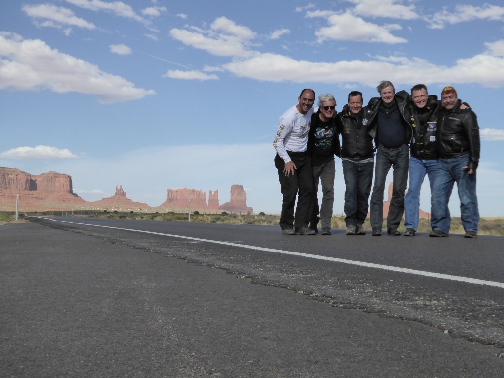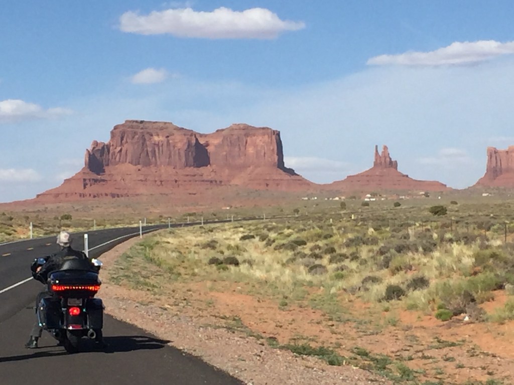 Singo is leading and manages to avoid a white coyote that charges in front of him. You can’t predict this sort of thing. We transcend a pass and there they are – the so well known irregular shapes thrusting up from the ground. We are almost runover trying to get photos in middle of road. We match the rocks to the shapes on our patches. We are the real thing! but we’ve had enough dicking around so it’s time to ride (HARD!).