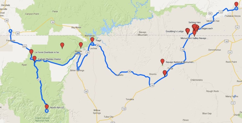 Big day today. We take Highway Alt 89 to Jacob Lake and turn right onto AZ-67 which takes us to the North Rim. After the visit backtrack 67 to Alt 89 and continue east to Bitter Springs where we connect with US 89 and proceed north before turning right onto AZ 98 East to Highway 160 and the a left turn onto Highway 163 and into Monument Valley.