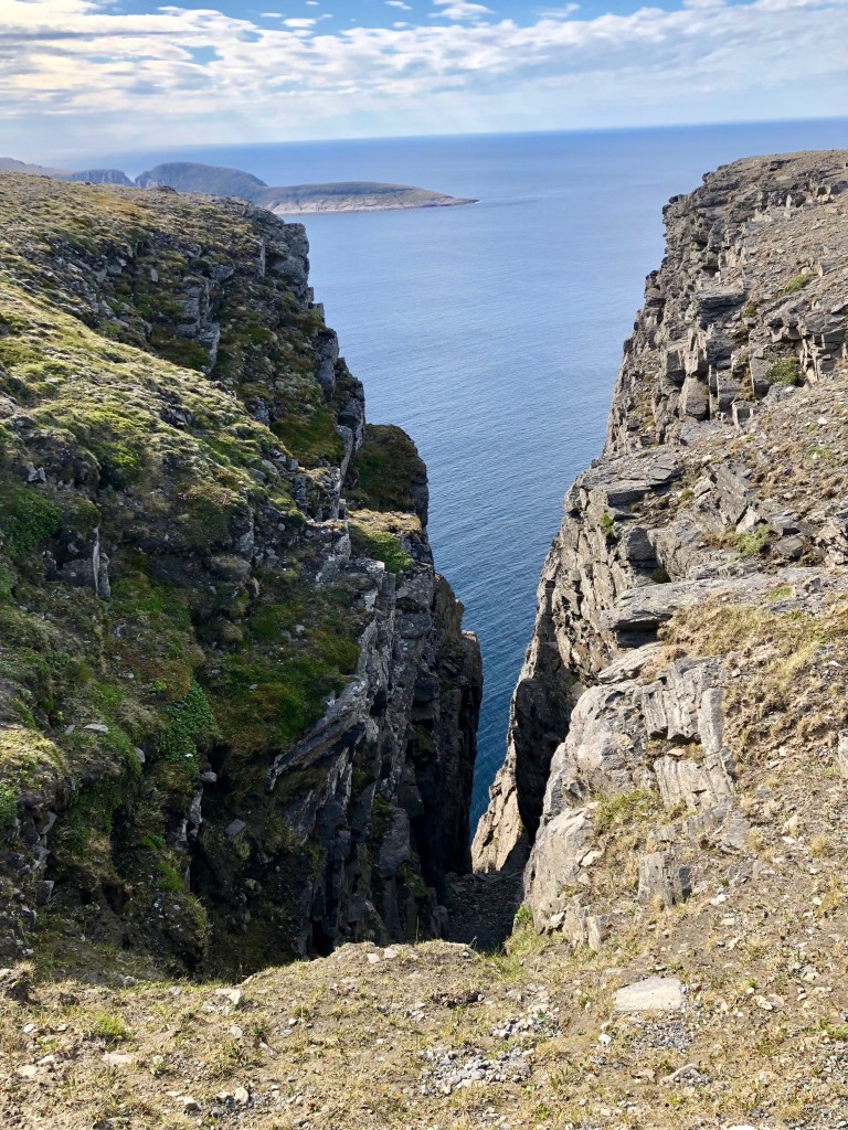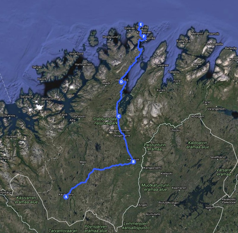 The ride this morning is through flat land but the road is gently meandering which makes for great riding at pace. Stop at the Sami Cultural Park for a break and then onto Lakselv for lunch. This afternoon we set off for Nordkapp. The first 2 hours we are riding north beside Porsangei Fjord. The road curves around the base of low hills. It is a fast run with little traffic on the road. There are a number of tunnels cutting through, the longest is 7kms. Cold & wet inside. Scenery is magnificent. Small villages hug the peninsulas jutting into the water. The deer are all over the road.