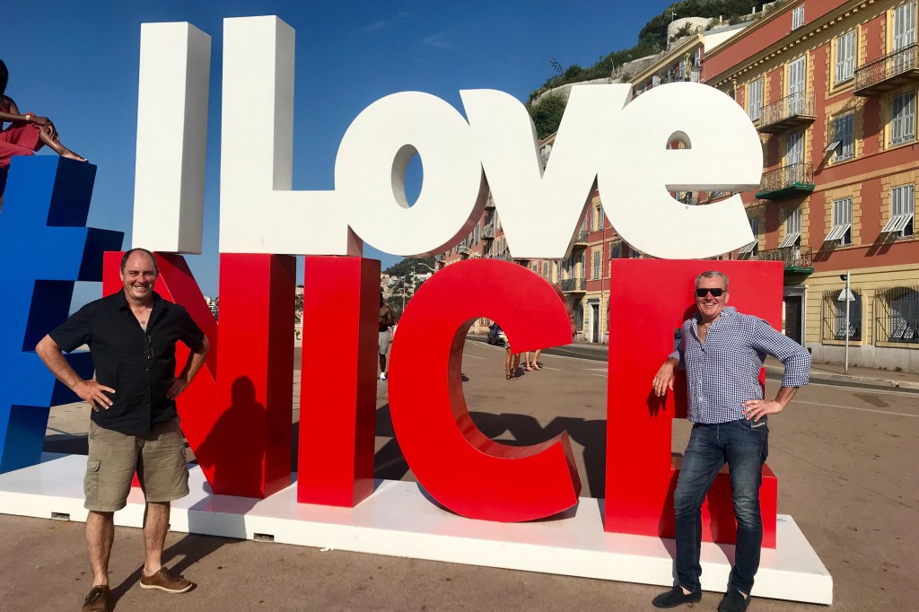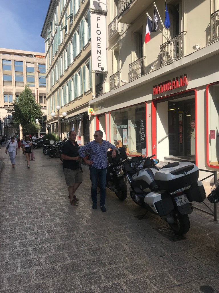 Arrived into busy Nice in very hot weather. Bikes parked at the front door!!! A drink at the Hotel Bar & presentation to Hydro of his bday present, the Marmot. Still to be named. Suggestions please!