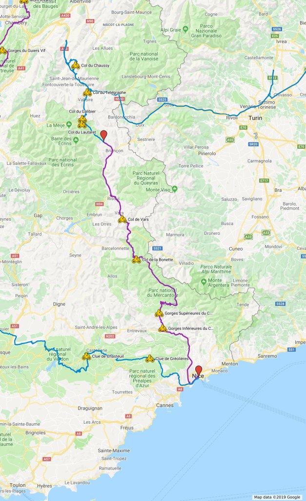 This could be another shorter day that should allow us an early evening arrival in Nice to relax. We havetwo choices, either traversing the Col du la Bonette high mountain road, or the scenic Col de la Cayolle and additional canyons. Assuming the road is clear, we will prefer the Col du la Bonette for it’s altitude and view. The alternate route is also approximately 60-70kms longer. Guess what, we took the alternate route!