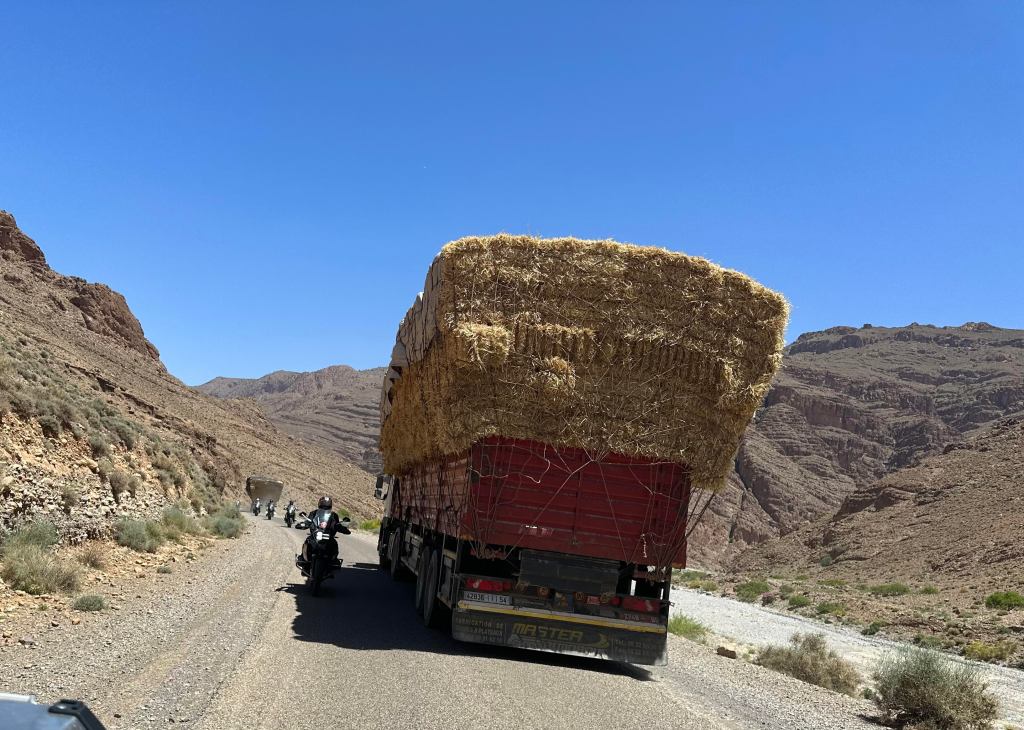 We are now approaching the Atlas Mountains. They are huge sedimentary rocks stretching for miles. There is no vegetation on the rocks. Again large river beds are empty. Would be magnificent in full flow. The villages are a little more quaint. The kids run to the edge of the road to wave at us. The roads through the mountains are narrow and winding. Good condition but we work hard on the gears.