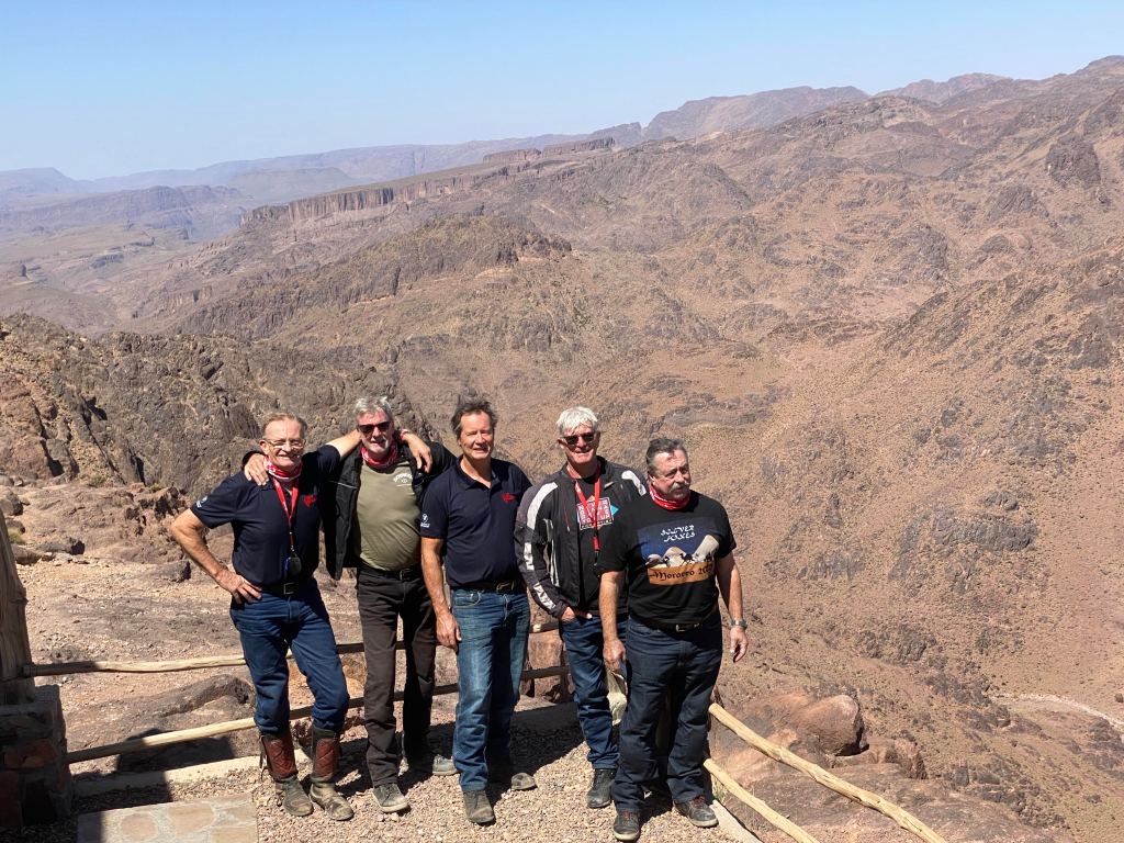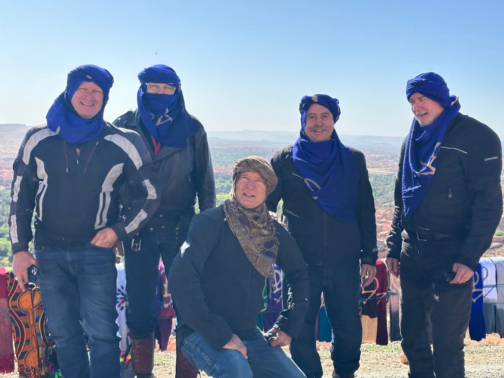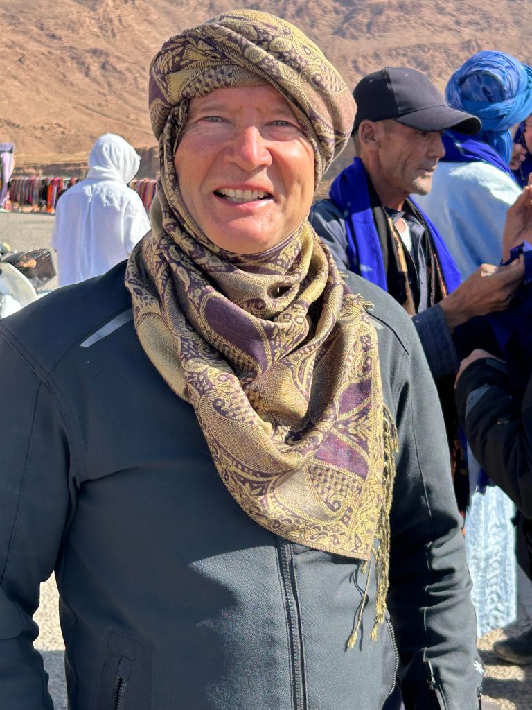 Back into the desert and stop for a view & photos. We are mobbed by professional Marroc scarf salesmen. We each succumb and get dressed up for photos.