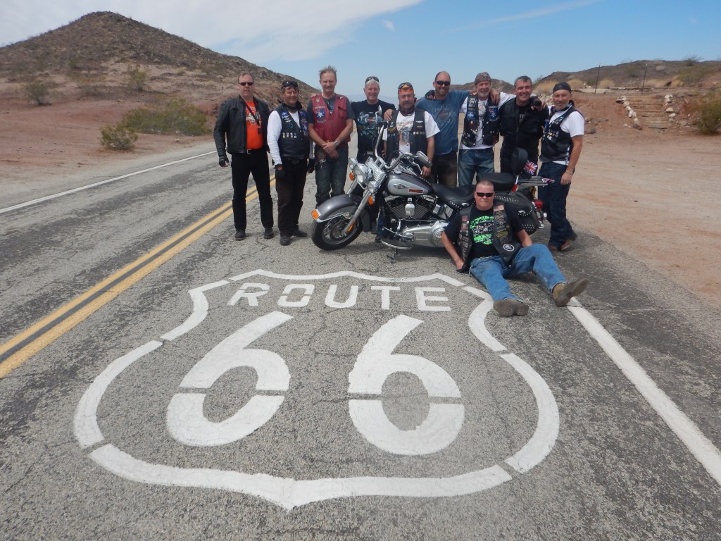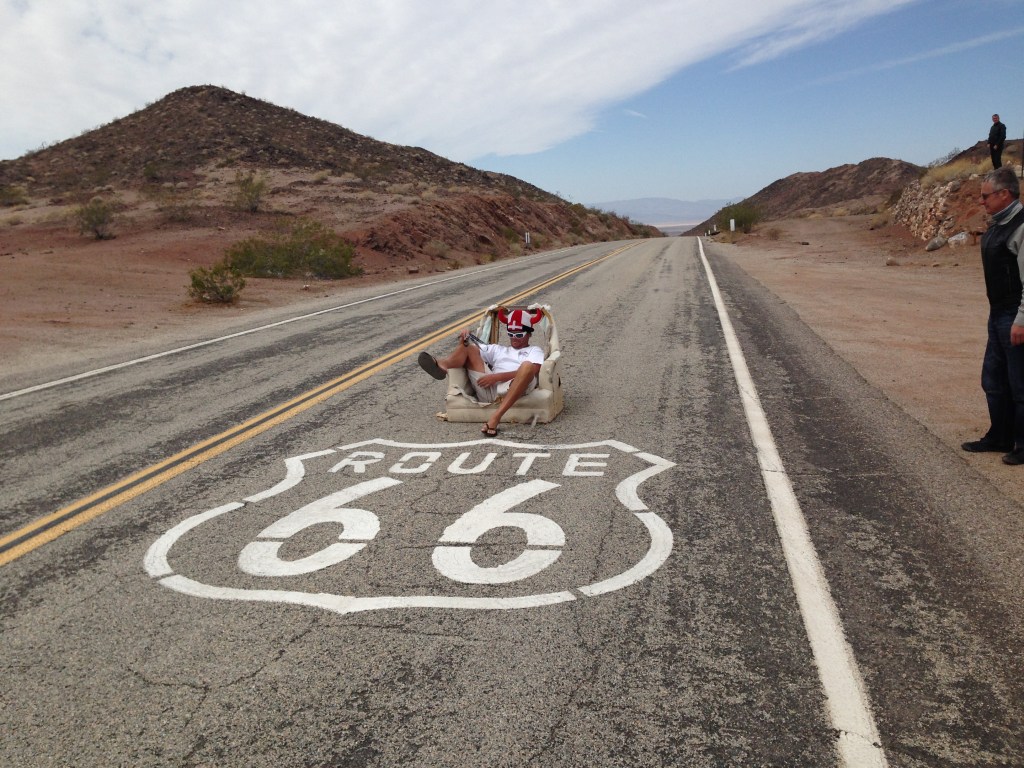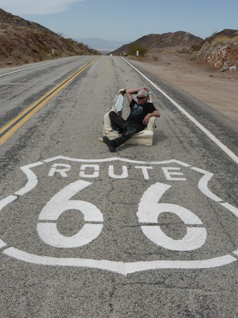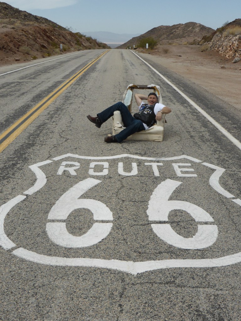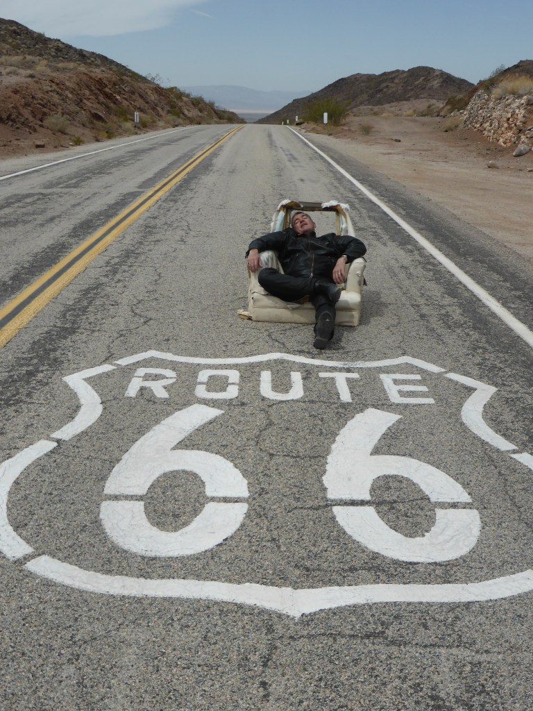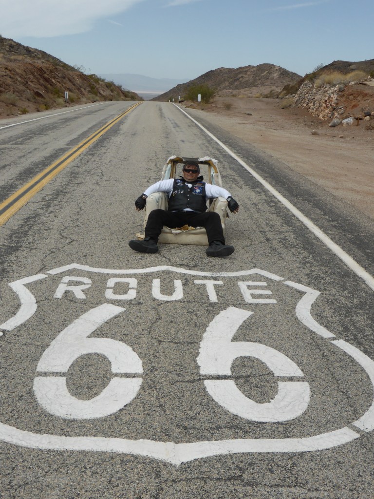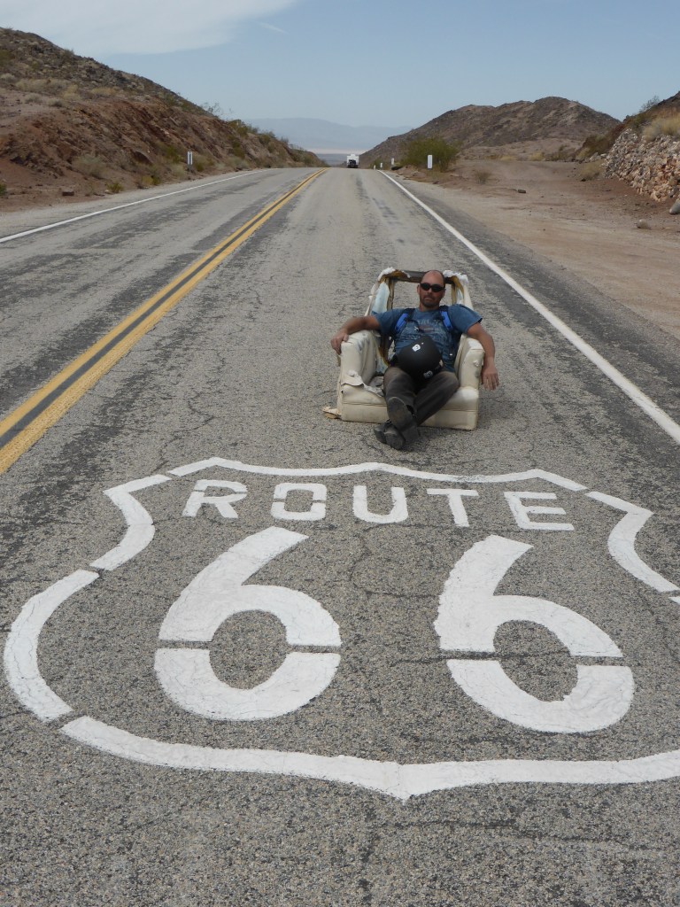 The sudden realisation hit us that today is our final full day of riding. The last 14 days is a blur. We mounted up and rode thru the desert. It is a mild day with blue skies. We refuelled & stopped for a photo of the Route 66 sign painted on the road and ended up sitting in an armchair in the middle of the road.