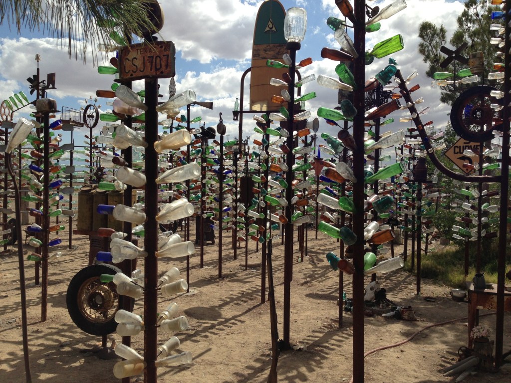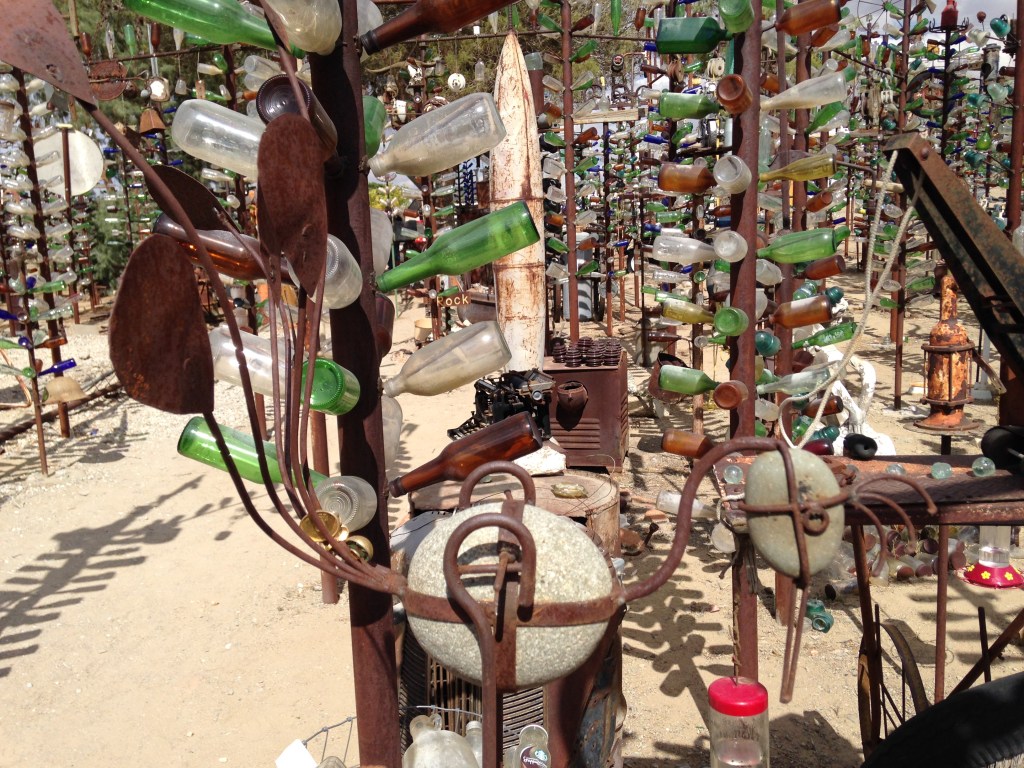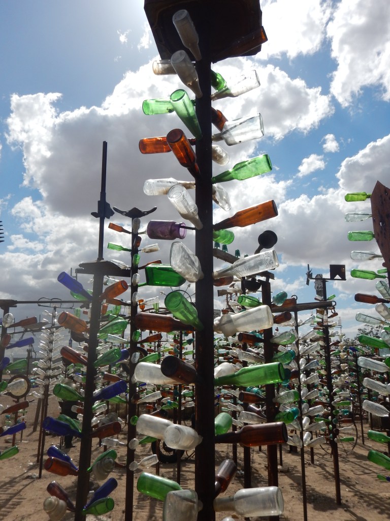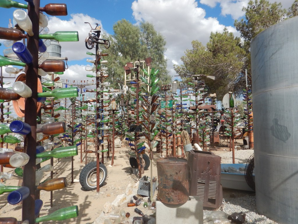 Next stop was Amboy, a town of 20 people, which was recently acquired on eBay for $425,000. It has a petrol station, hotel and post office. Not significant, it was just a break. The final stop today was Elmer’s Bottle Farm. He is an eccentric little man who built a forest of metal trees covered in bottles. Interestingly, many hummingbirds were feeding. A lot of us have never seen one before.