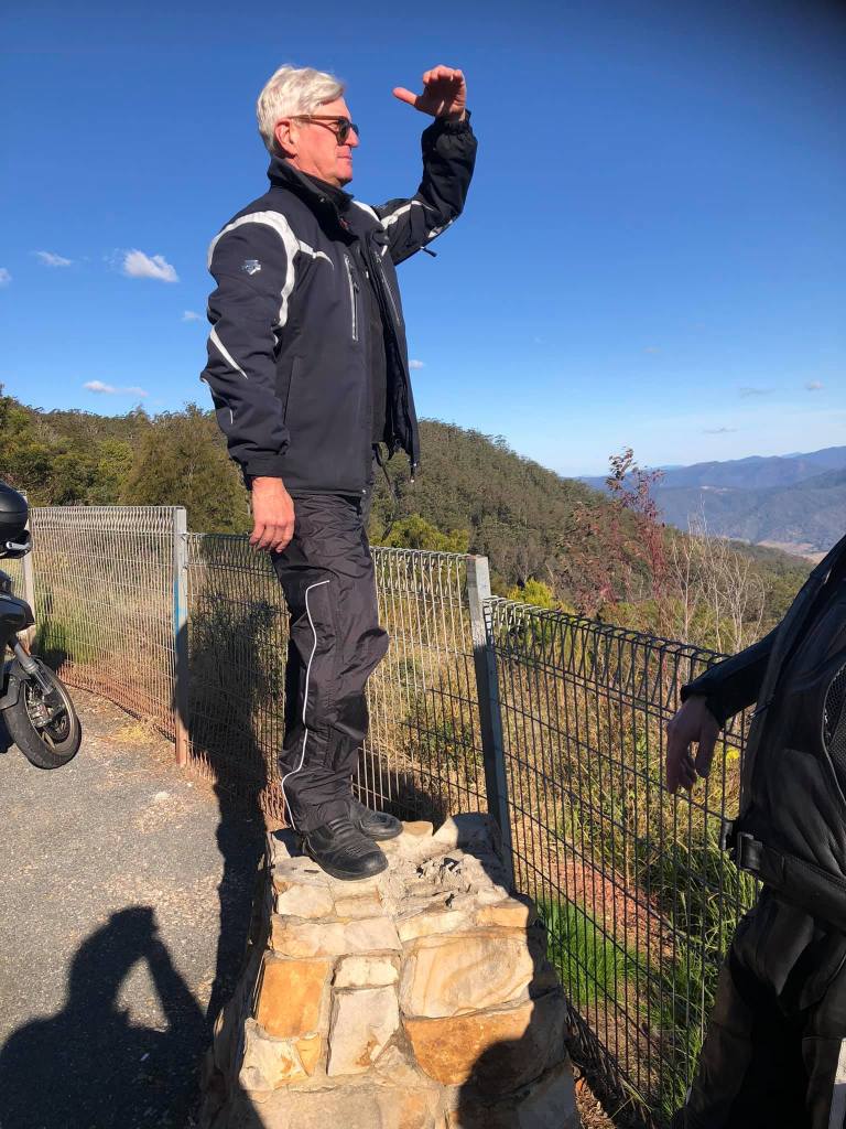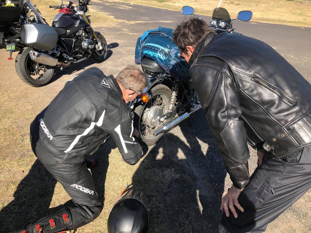 Bfast at Beachwood Cafe, Yamba.A push start for Mike. This effort on the part of the Foxes tested our capacities & caused some minor injuries. We head from Yamba to Grafton to fix Mikes bike. A few hours are spent in the least salubrious parts. Every mechanic in Grafton had a look at it. In the end Mike took his bike apart, Andy did all the hard work replacing the battery, Russ provided a socket, Boxy was busy trying to jump start the Bike. Singo….got nothing, sitting under a tree.We’re back on the road. Gwydir Hwy to Glen Innes. Beautiful undulating plains then into the Gibraltar NP. Photos at a lookout. Back onto the flats for a run into GI. Feeling cold