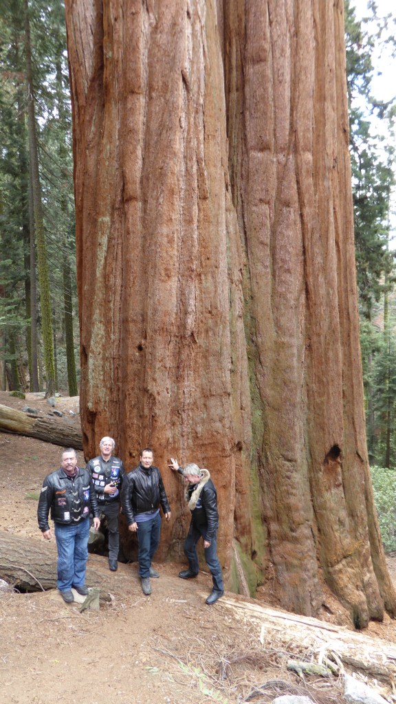 We are in Full dress uniform now for the cold heights. We are riding at the height of Kosciusko. We stopped at the General Sherman Tree. 2,200 years old and biggest girth in world (Hydro reckons he gives it a run for his money). It is part of giant forest. Too much frolicking in the forest has left us short of time. It’s time to head for our hotel, so we have to ride (hard!).We are driving through narrow roads with monstrous Redwood trees by the road. They are awesome. Then we embarked on the descent from 7000ft amongst amazing views and lots of tight turns (which we would not have done very well a few years back). We then settled on to the freeway to Bakersfield through orange orchards which deteriorated into oil pumps and barren land. A diverse country no doubt. Arrived at our hotel at 7.30.Beer & Dinner at the rib house next door to the hotel.