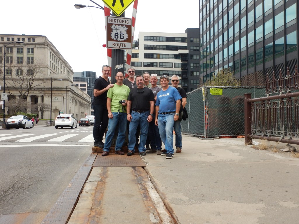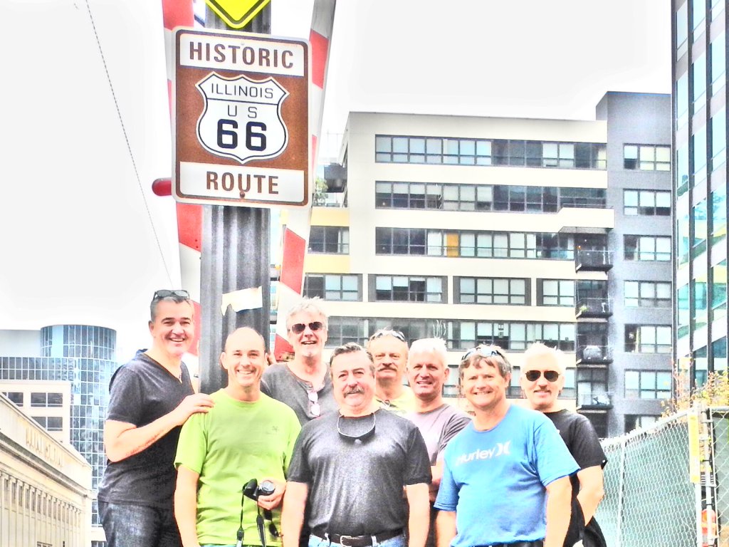 Then a stop at the starting point of Route 66 on Adams St. Note Gibbo kissing the ground, pathetic really but we encourage this over the top behaviour.