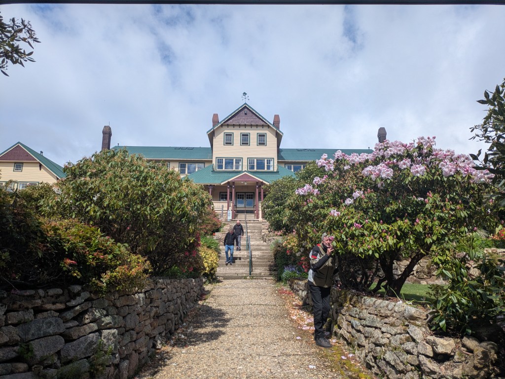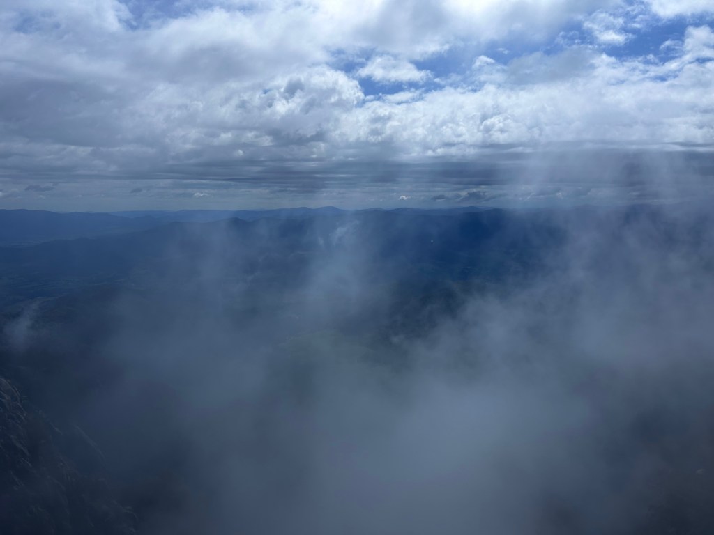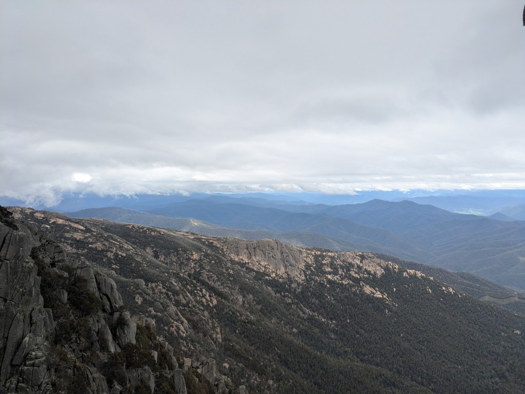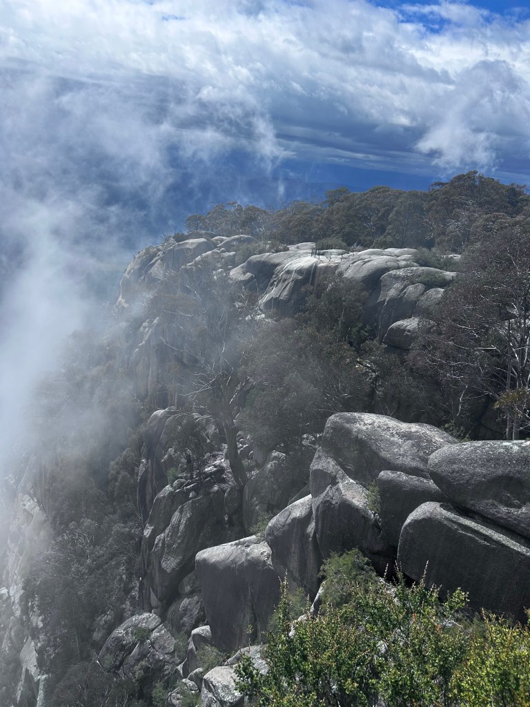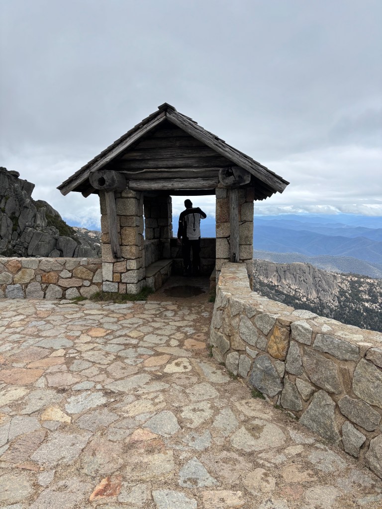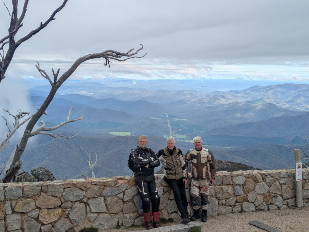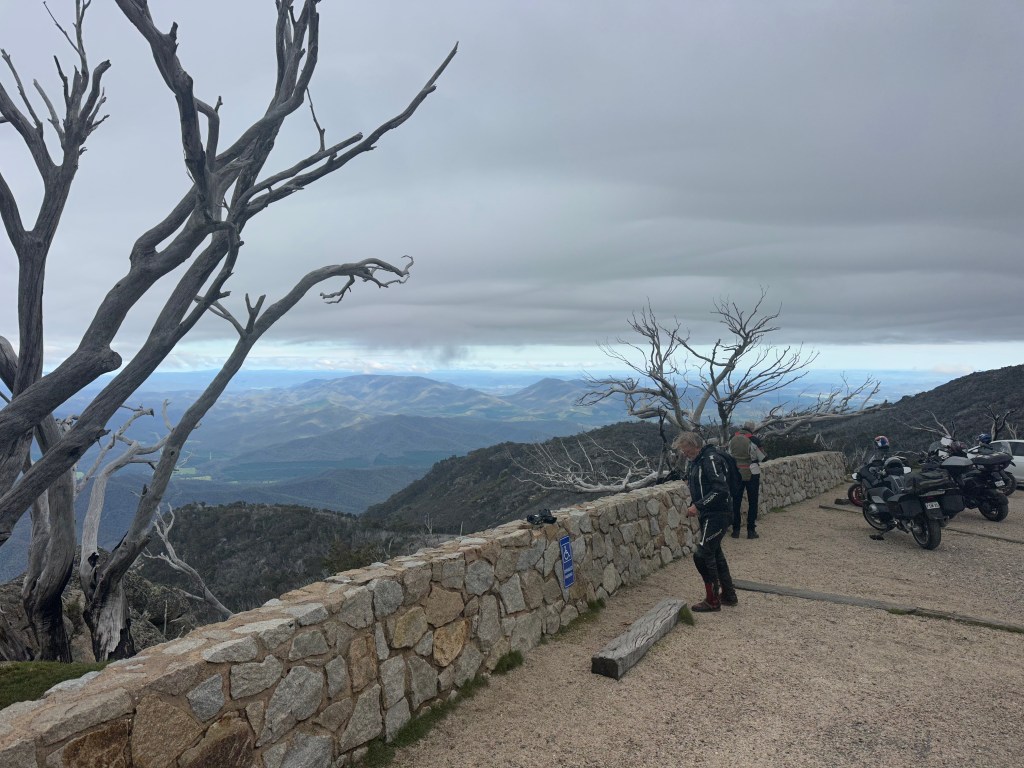 Hydro has assumed leadership of the group (offered to Singo who declined as he had no idea where he was going and had no aspiration for the role) & heads up to the peak of Mount Buffalo. We were warned that the last 3 kms were dirt so no surprises. The climb was long & provided a wonderful example of curvetage. At the top it was cool but provided an expansive vista of the Snowy Mountains. The clouds were being whipped around us by a strong wind. We smelt the flowers, had a coffee & moved on.