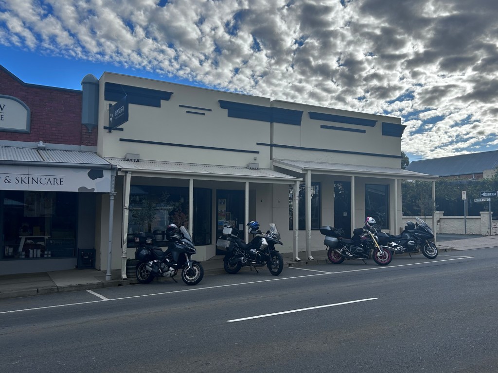 Russ dropped his bike off for a tyre refit & we headed to ‘Thick as Thieves’ Cafe for breakfast. The tyre fitters were responsive & we were roadworthy by 10am.