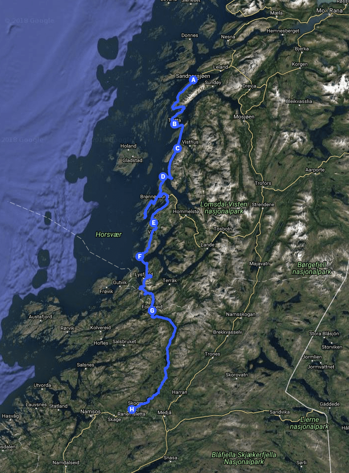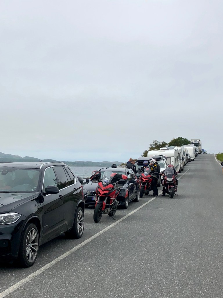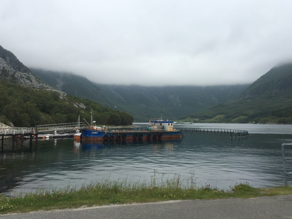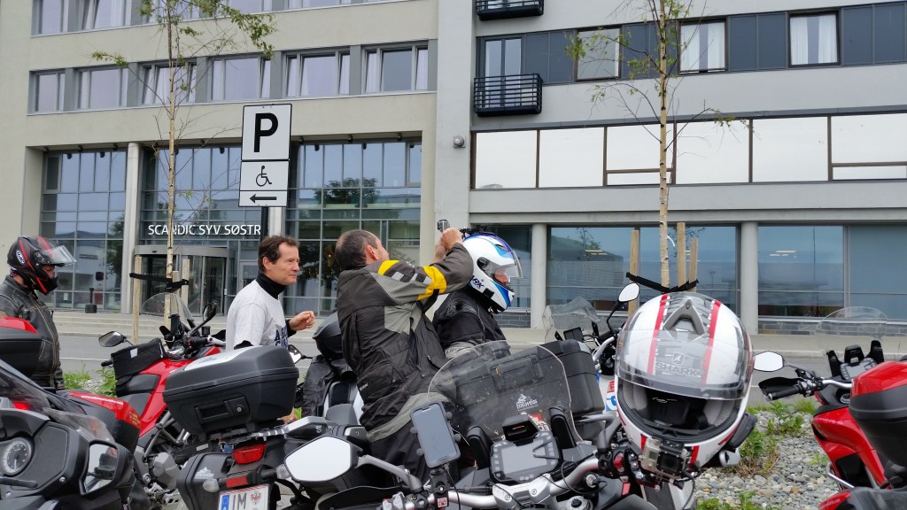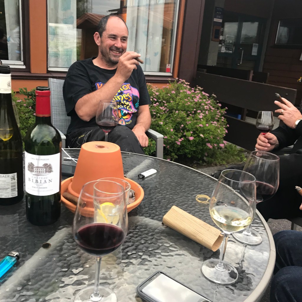 Mike is on the phone to Miselle….AGAIN. As at 3pm we have only travelled about 100kms on the bike. Having tasted the healthy delights of Polse (Norwegian Hotdog) we now disembark our final ferry at Holm. The next 2 hours to Overhalla are extraordinary. Long winding roads, immaculately smooth, running beside a small river on one side and mountains on the other. Some serious cornering happening here. BMW’s are outperforming the Ducati’s. Arrive at Overhalla Hotel & straight to the bar which is full of sub-Arctic menagerie. Having lots of fun. A wonderful dinner & wine selection at the Hotel tonight. Robbo has crashed so the boys move outside for Cuban Cigars & Red Wine and a few more laughs.