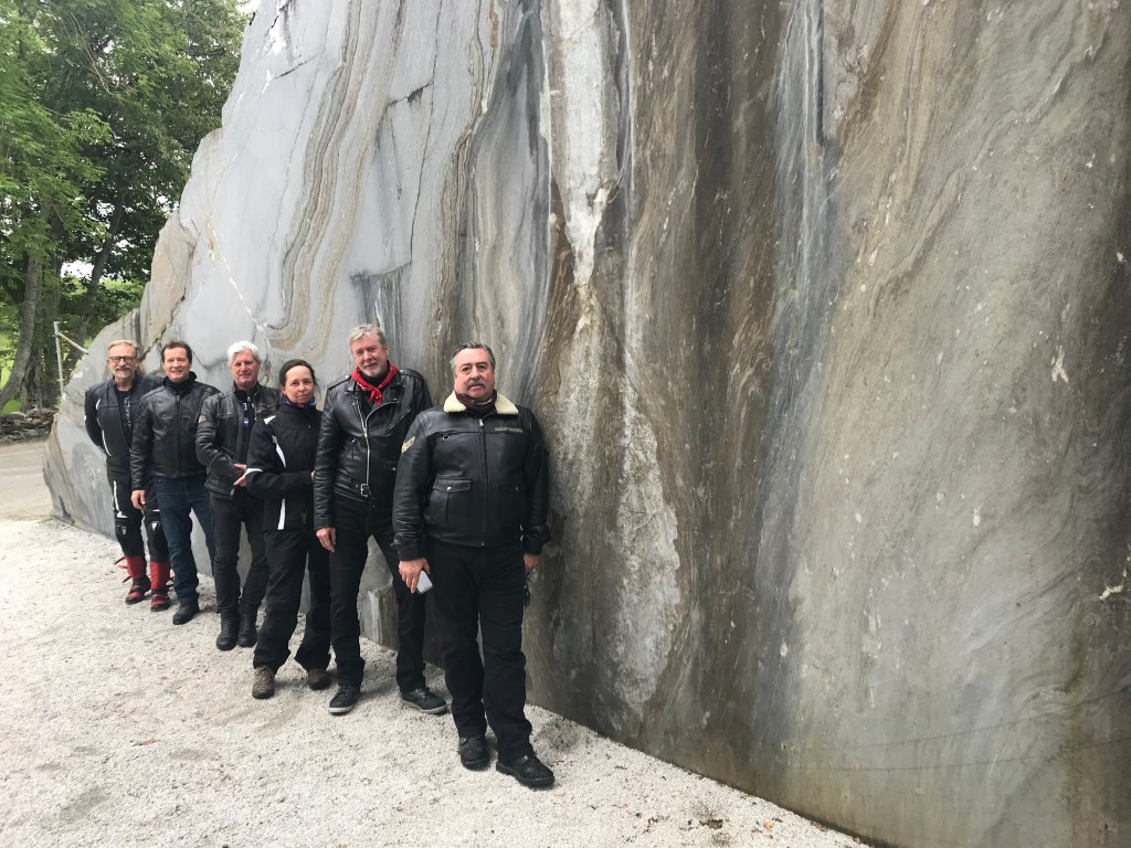 About to leave Sandnessjoen but Gibbo thrown into a panic. Pulling the van apart looking for his wallet. Oh look, it’s in my backpack. A few too many G&T’s last night perhaps? Our first stop is an old mediaeval church at Alsten & a particularly beautiful polished granite wall. “Robbo” having a great time with the boys.Next stop is Brønnøysund where we set out to conquer the ‘hole in the mountain’. In full riding gear we set off up the mountain. Not long before the winging starts. We didn’t sign up for this! Hydro loses his phone which is returned by a hiker. Ultimately, Russ, Mike & Singo complete the entire 6km route. We head south to a series of ferry rides to get us back to the main land. Everybody very industrious tying down their bikes on the ferry……except Russ & Singo who are appealing for help. How do these things work? How could we have missed such a basic education? We have other skills!! Upstairs over a coffee, discussion turned to arrival into Trondheim tomorrow. Singo noted that Jane was in Trondheim today & suggested he might leave early tomorrow. There was a heavy silence. Foxes reached for their copies of the Constitution. Boxy suggested he wasn’t really proposing a break from the group (?) and that he should withdraw the comment to avoid confusion. Faced with a caution, or worse, expulsion, Singo withdraws unequivocally. Everything now back to normal.