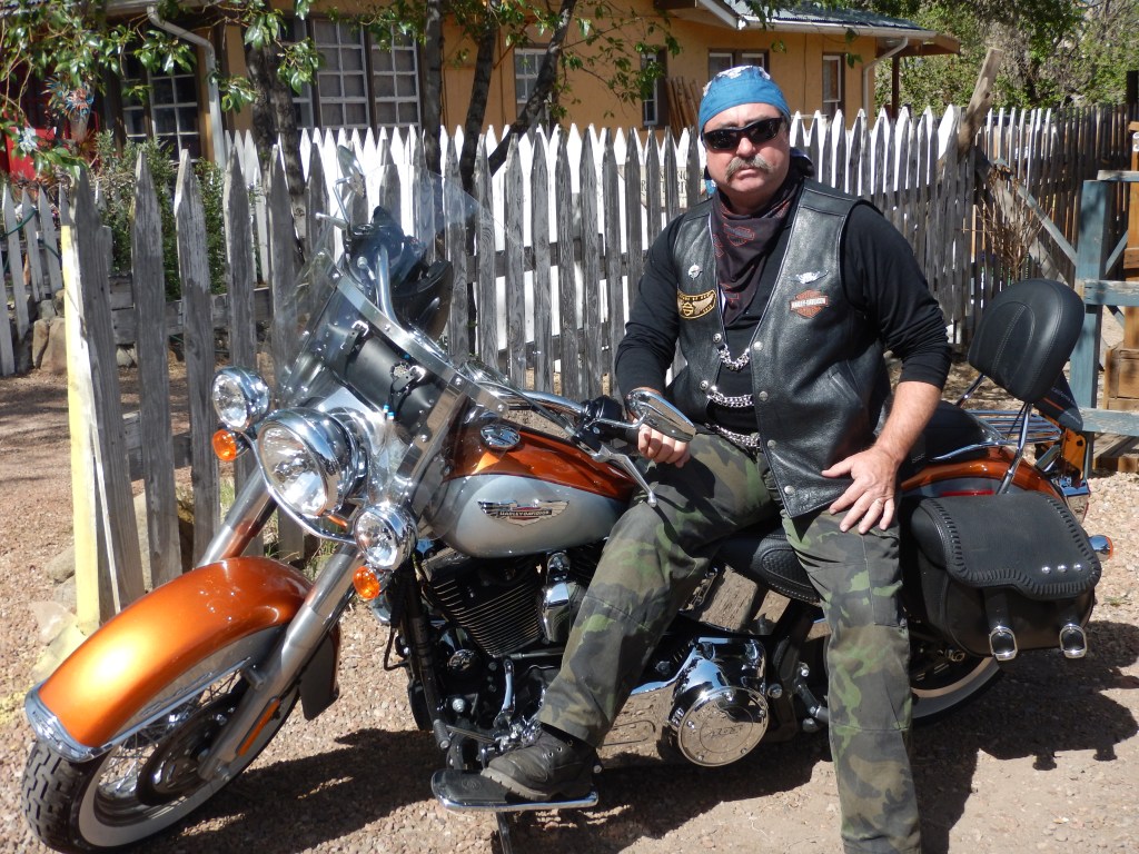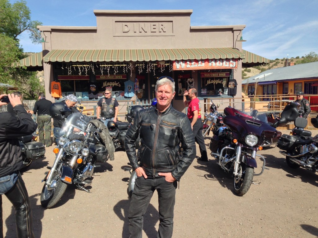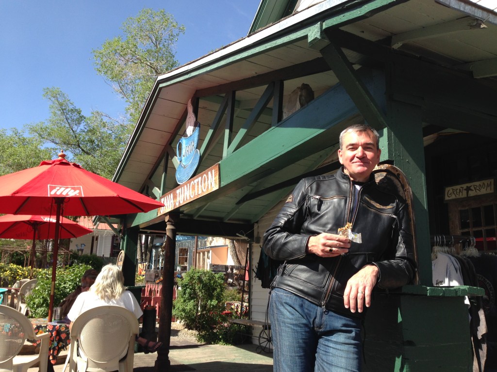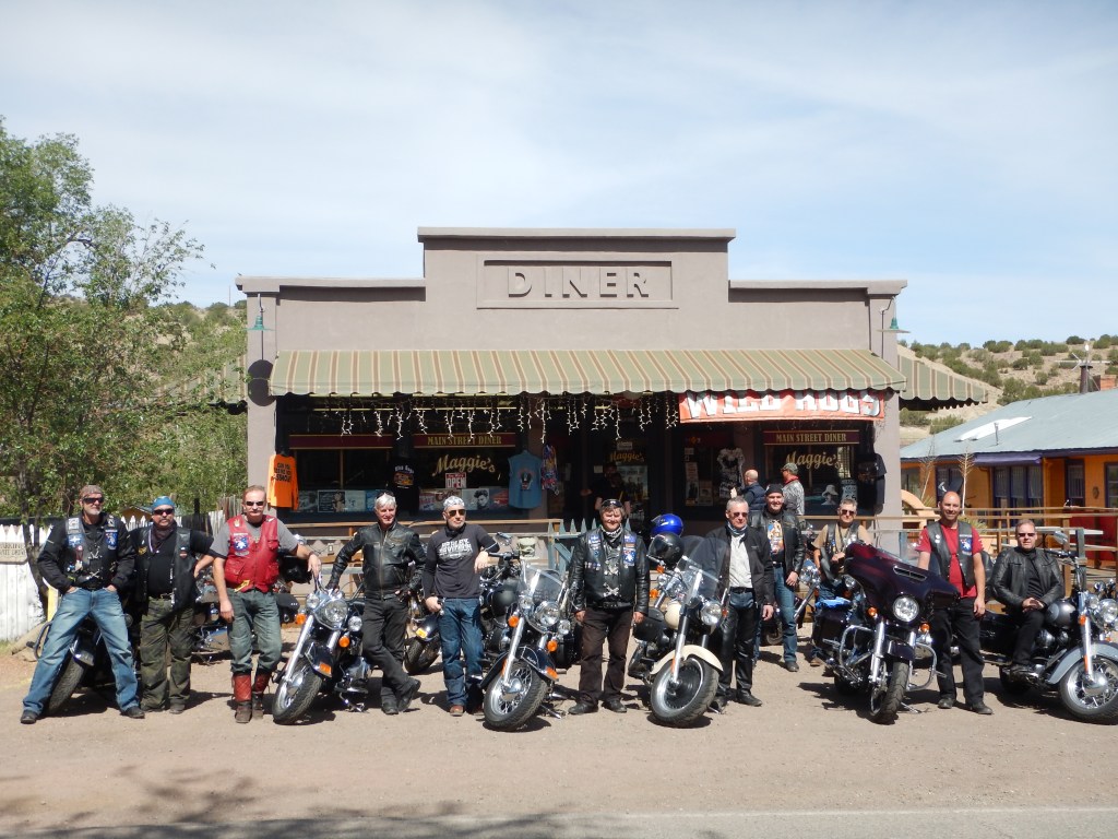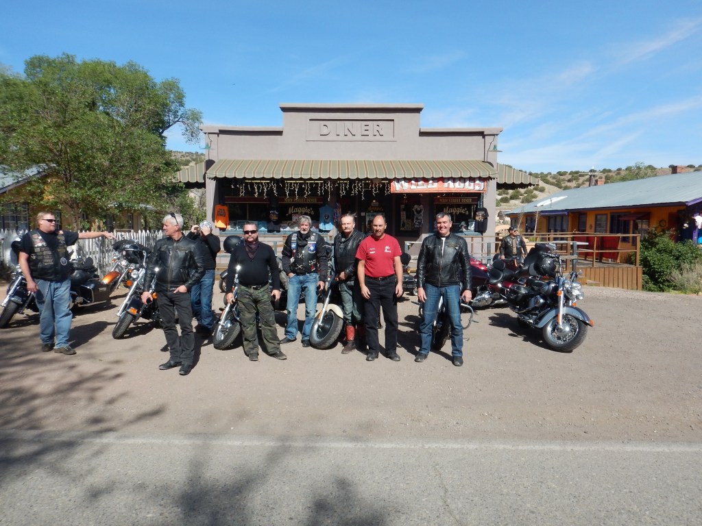 Back on the bikes today. Let’s Ride! Definitely when the Foxes are at their best! Weather is mild and we ride through more scenic country (imagining we are on horses in a western movie rather than bikes). First stop was a quaint little shop in a little town called Madrid. This was Maggie’s diner in the movie ‘Wild Hogs’. More patches, t-shirts.