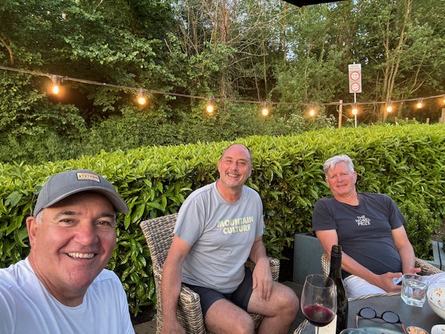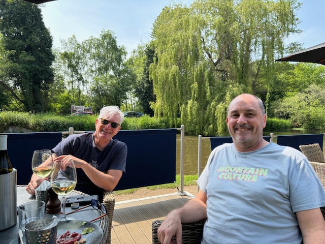 Russ arrived the next morning to hear sketchy stories about some Caberet club. Enough of this; Russ, Tony and Steve hoofed it to a quick lunch on the river at Wisley which took eight hours to complete and a new appreciation of Chablis, while Pete and Janelle met up with the London Foxes for some ABBA activity.