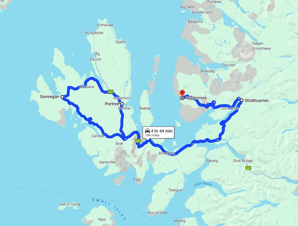 Next stop Portree. Its a quiet road & we make good time to Portree. But the town is congested., a tourist trap & its only May! We do a u turn & head out. One more stop for “The Last Farewell” photos of Skye & head back to Applecross. I think we agreed that the island was underwhelming.
