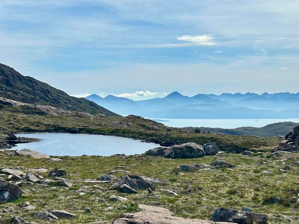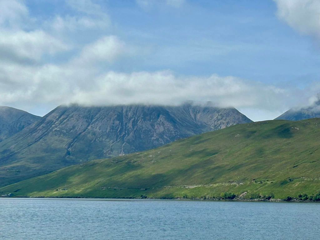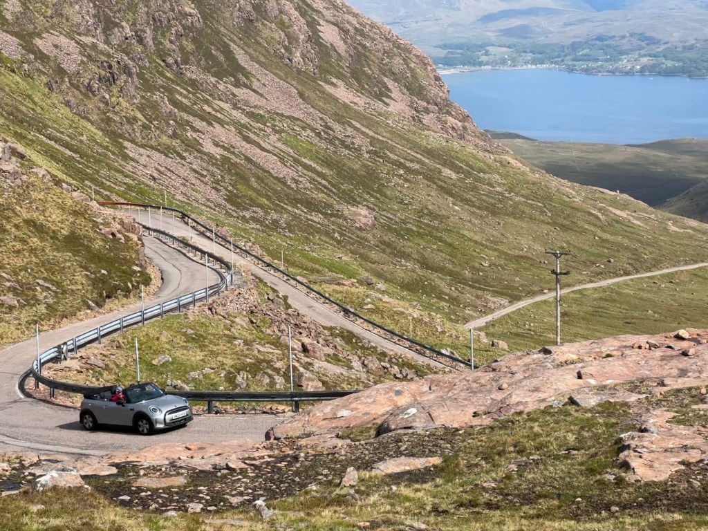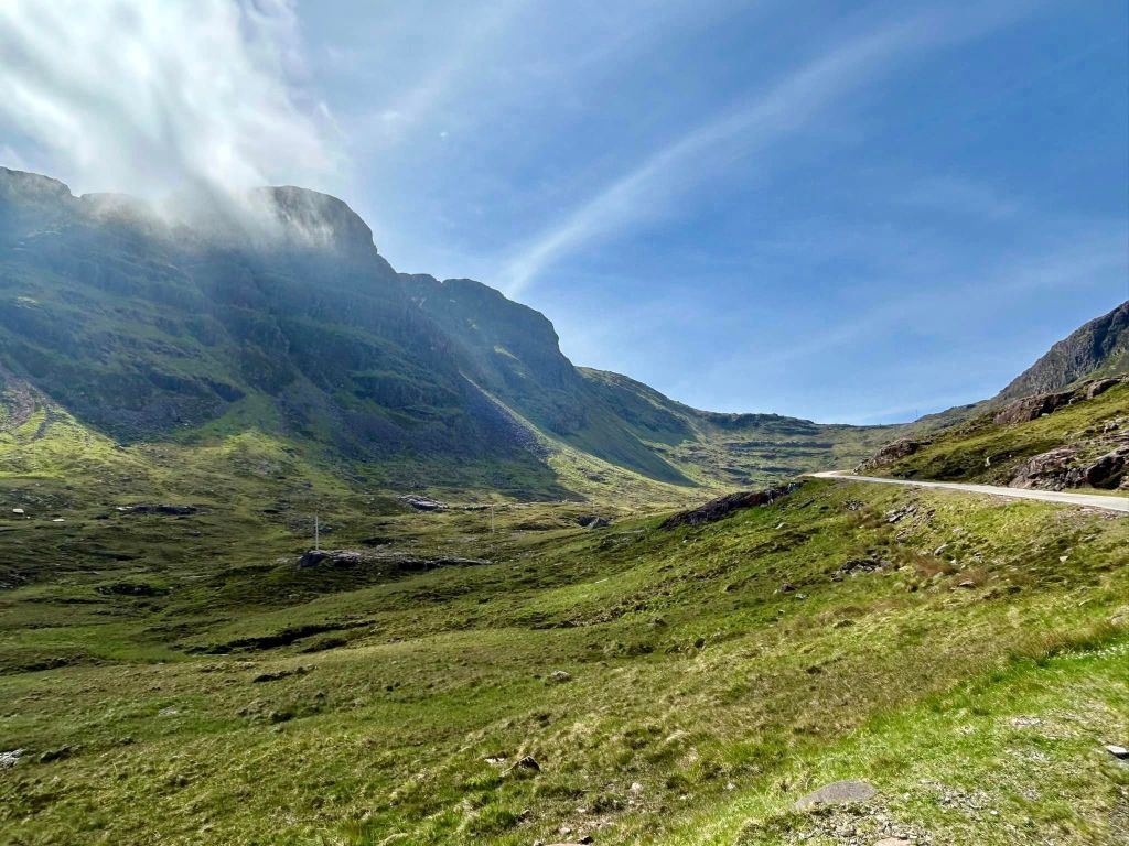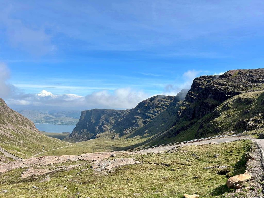 The return trip is via the Bealach na Ba pass which was covered in heavy cloud this morning. Wow. What a difference. The road is very thin, almost like riding on a ledge. Traffic going both ways requires deft use of the passing bays. The valley is bordered by huge rocks in height & width. We saw none of this going down. In review, this landscape was more impressive than what we saw at Skye & it was only 10 miles from our hotel.