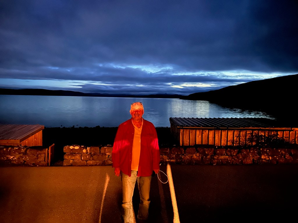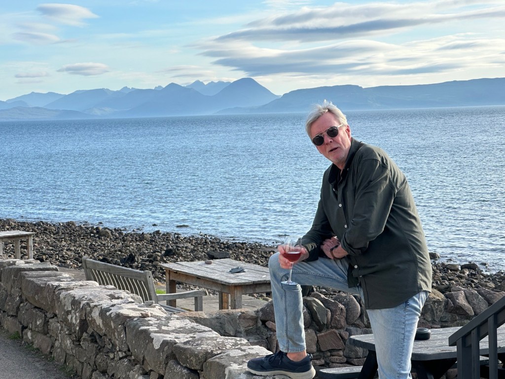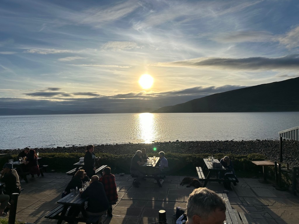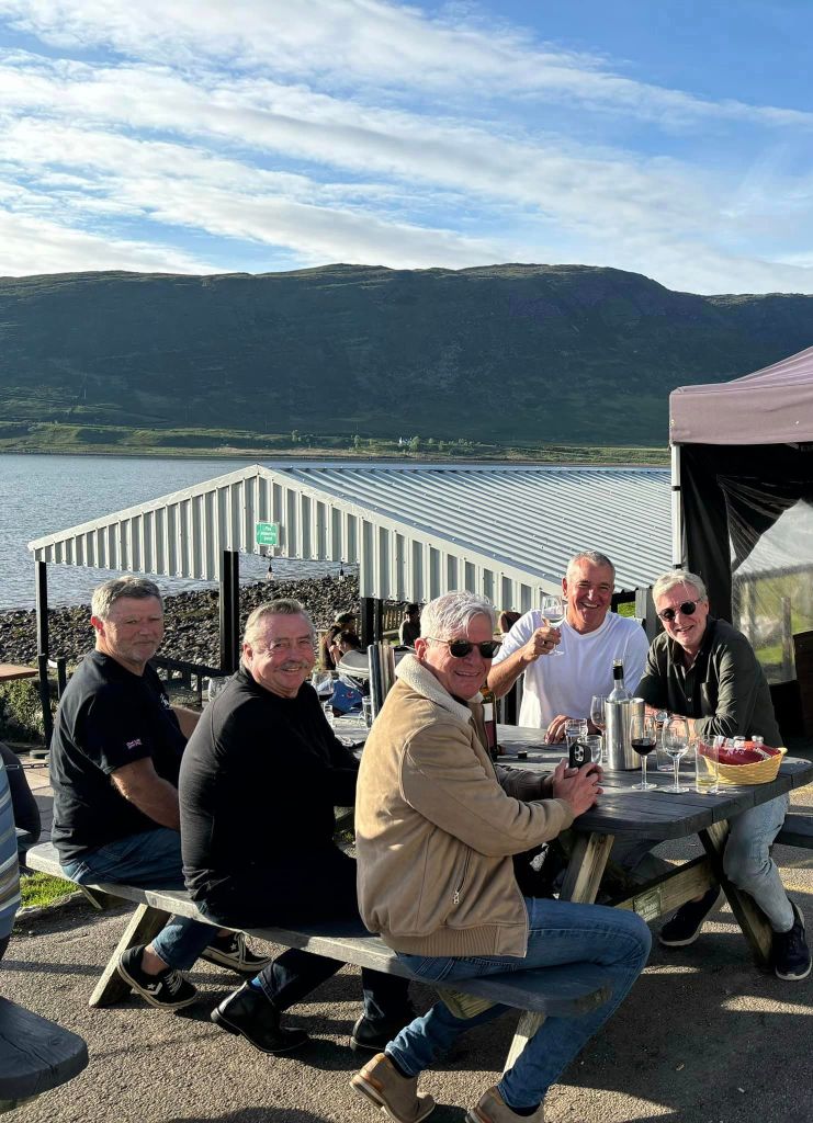 Back at the Applecross Inn, it’s drinks & dinner. Russ produces a myriad of musical productions for our wives. We are dining outside on a warm evening. When we left this morning, we never thought we’d be out here. Steve is discussing his nasal hair. He gets very lonely in the car on his own! We are blessed!