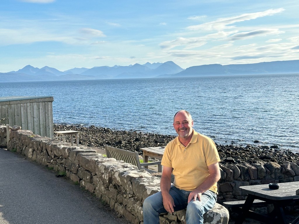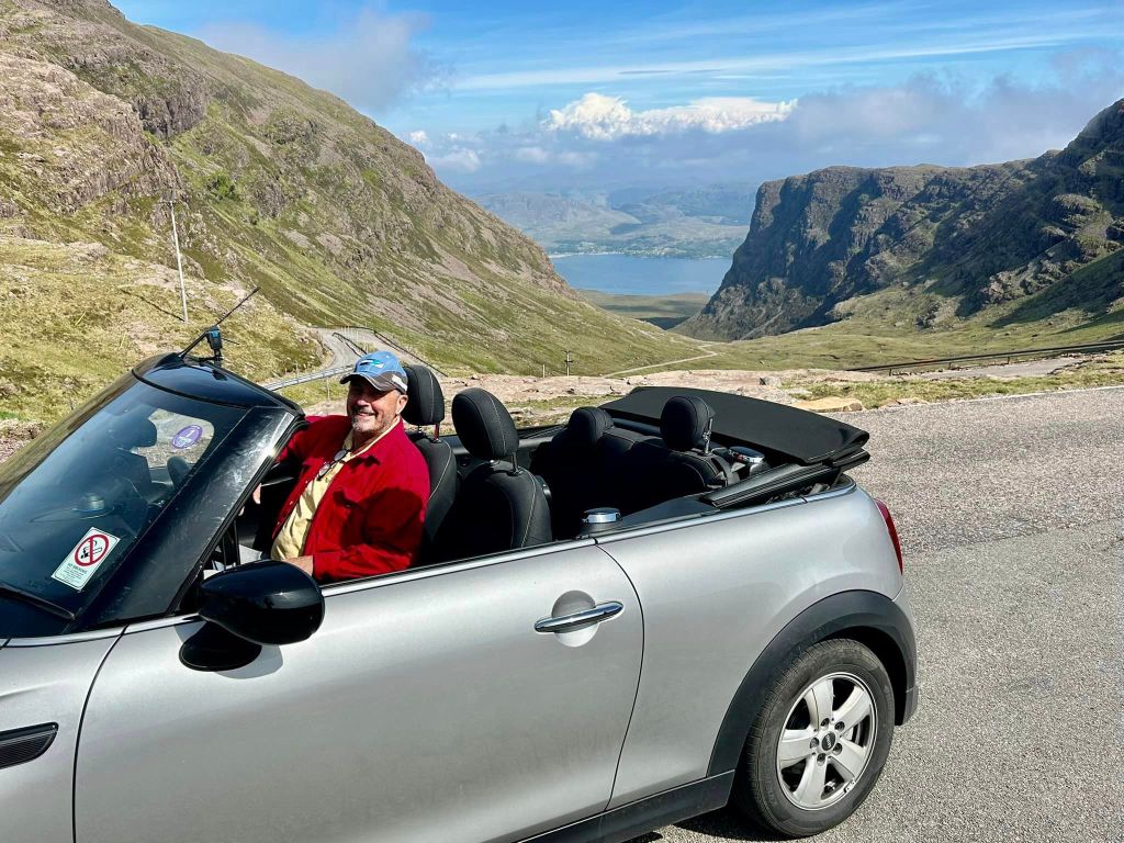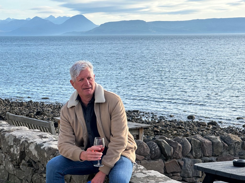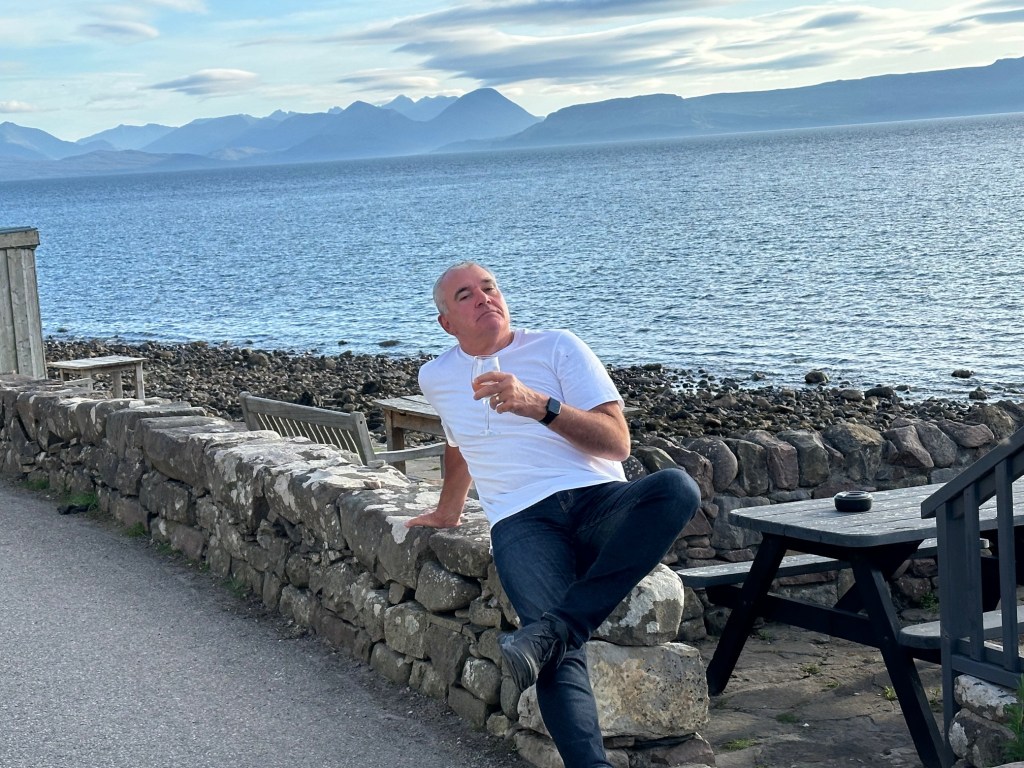 Back at the Applecross Inn, it’s drinks & dinner. Russ produces a myriad of musical productions for our wives. We are dining outside on a warm evening. When we left this morning, we never thought we’d be out here. Steve is discussing his nasal hair. He gets very lonely in the car on his own! We are blessed!