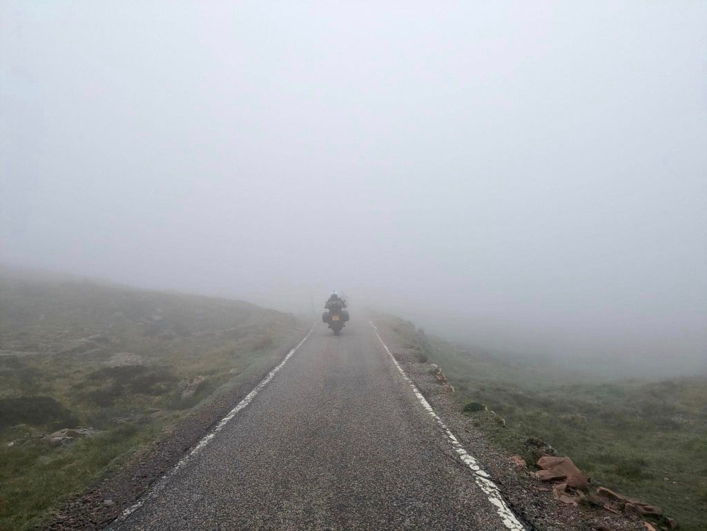 Out of Applecross & up into the hills & the famous Bealach na Ba Pass. Within 5 minutes we are blanketed with mist. A single lane track winding through the hills, we crawl in 1st gear. Visibility about 50 feet!! Tony is out front & contemplating a change of trousers. It is cold. We pass two cyclists walking their bikes up. Strewth, when will it end.