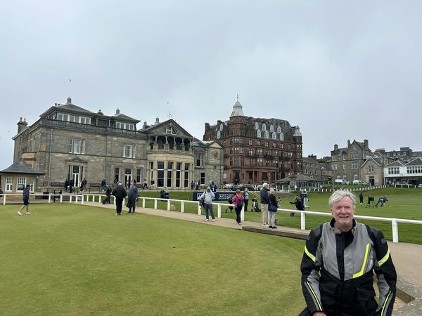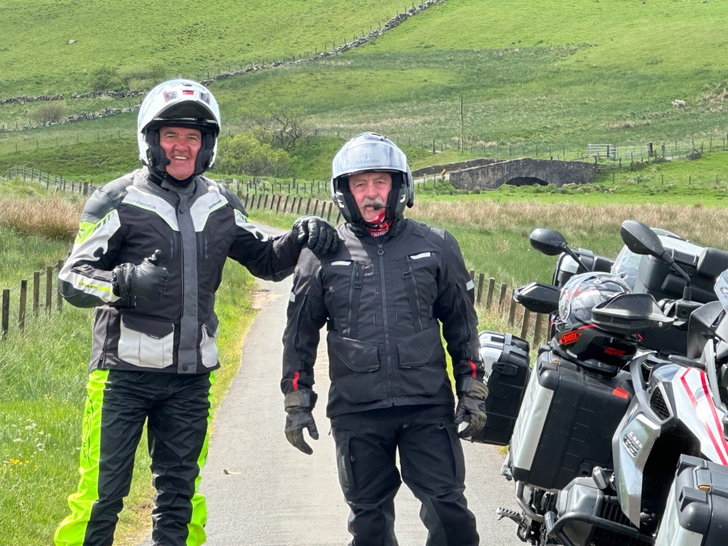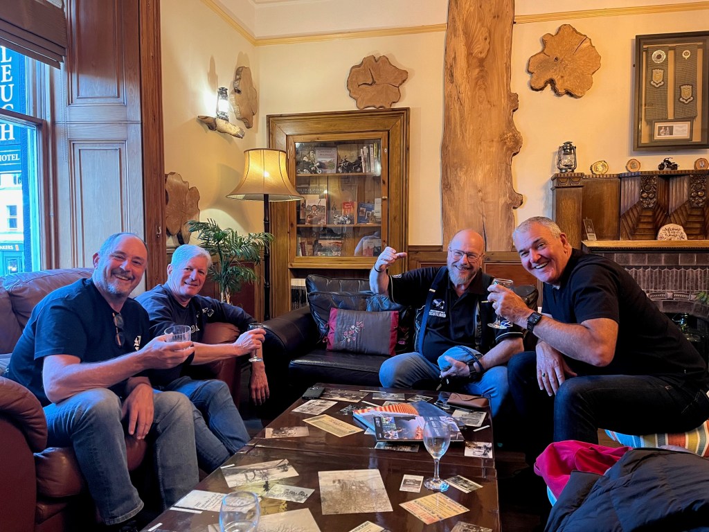 Lewy’s bike is in Dundee being repaired. Steve drives Pete in the mini & Singo rides along. The bike is secured & we head to St Andrews Old Course for a look. We grab some t-shirts & head to Moffat. Steve chooses every B road to make the trip more interesting. It’s a full day, arriving the Baccleuch Hotel at 4pm. Dave is a passionate biker & welcomes us in. Has a shed full of cleaning materials for our bikes. Yeah….nah.