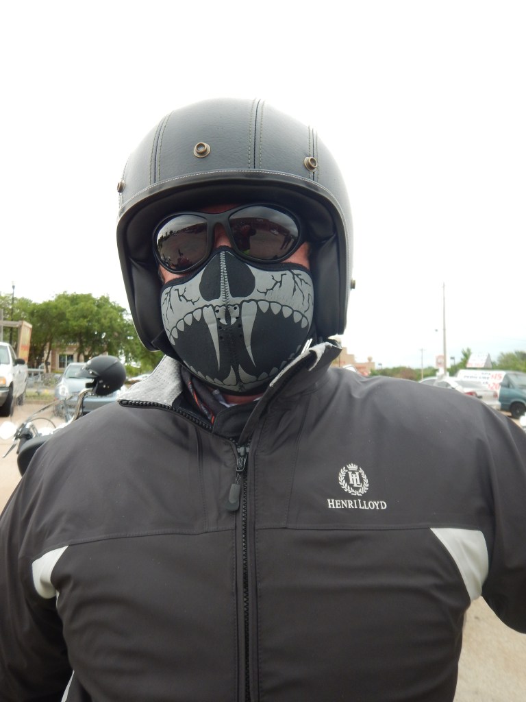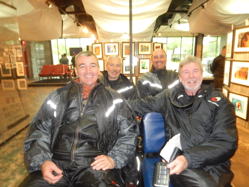 First stop this morning was the Harley shop to buy more essential clobber – boot straps. We were quickly into our wet weather gear and struggling to see where we were going. Tested our limited abilities on these big bikes but we’re up for it. Thankfully we only got a short ‘biker shower’ and were able to revert to normal riding gear. However, the winds remain ferocious.