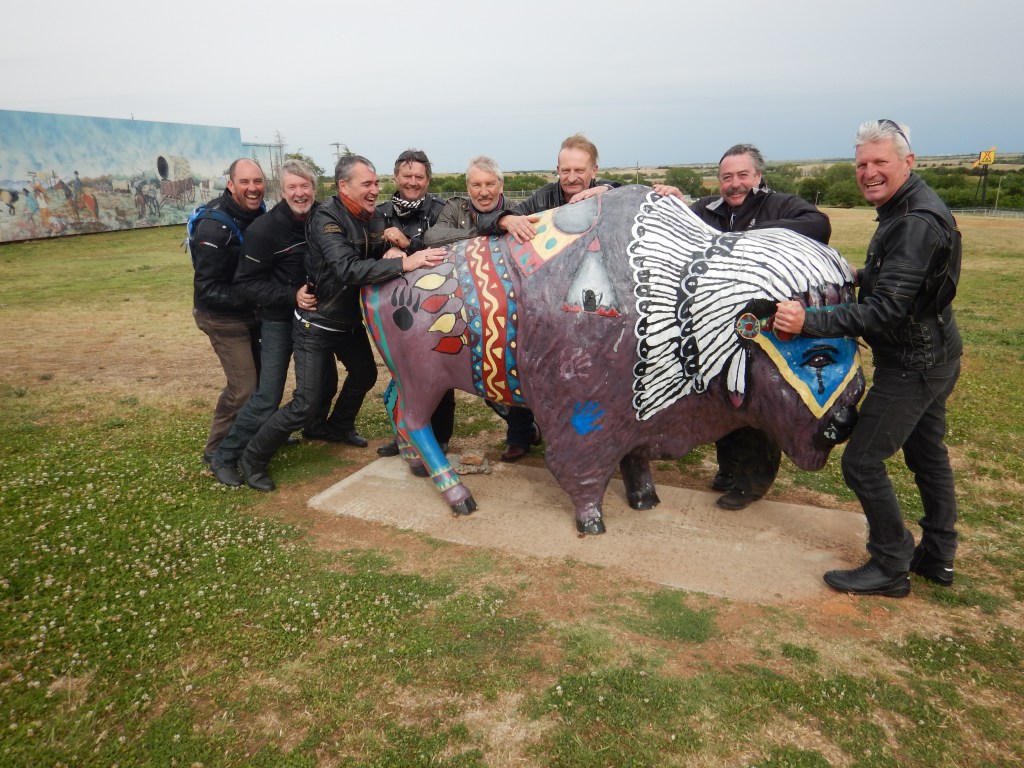 Our last stop of the day was a truckstop in Cherokee country where we did a stupid photo with a model buffalo. The final hour of the ride today was a hoot. All of it along the original narrow Route 66. With very little traffic we hit it hard and had a ball.