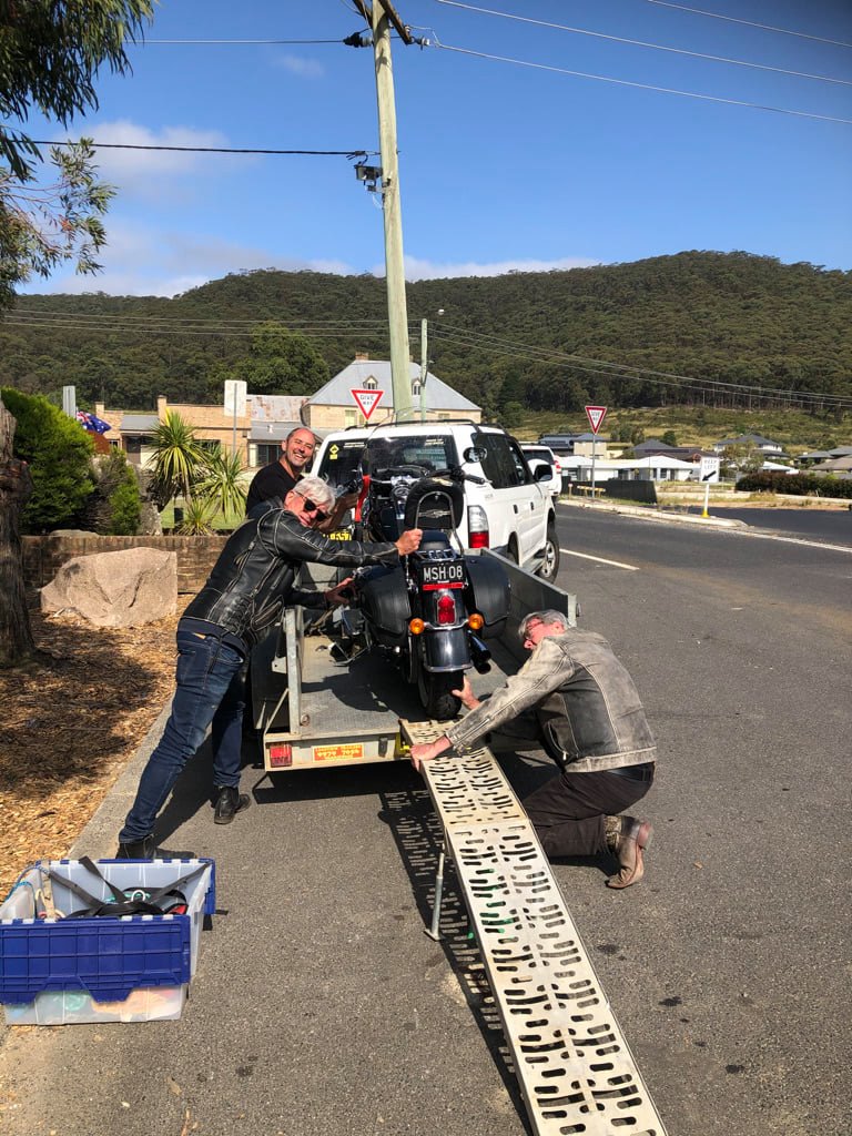 Unbelievably, on this minor road, an ambulance appears around the corner. It stops and attends to Boxy who is sure he’s ready to get up and ride out of here. A quick decision is taken by the Foxes Recovery Squad…..He is strapped down and taken to Nepean Hospital. As the ambulance drove away we could vaguely hear Boxy mumbling “I’m a celebrity get me out of here”. We had warned them of his condition. Trudy concurred with our decision and said she would catch up with him in a week or so….something about wedding plans are a priority. Russ rode Boxy’s bike into Lithgow (without running out of petrol). Lizi (Robbo) McGeorge has hitched the trailer and is hightailing it from Sydney to Lithgow to pick up the Bike. Legend. The level of support to which Foxes wives are asked to commit to. We escort her home.PS. Boxy had several broken ribs and a collapsed lung. Surgery the next day to secure titanium plates to a few of the ribs and partial cut out of lung. His recovery is impressive. Home in 3 days. Unfortunately he has taken to circulating naked photos of himself, maybe a little too frequently, to show us all how bruised he is. Facebook are considering removing him from the platform unless he desists!