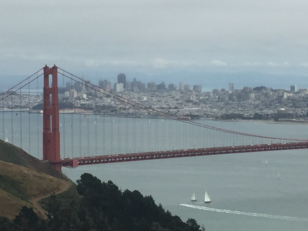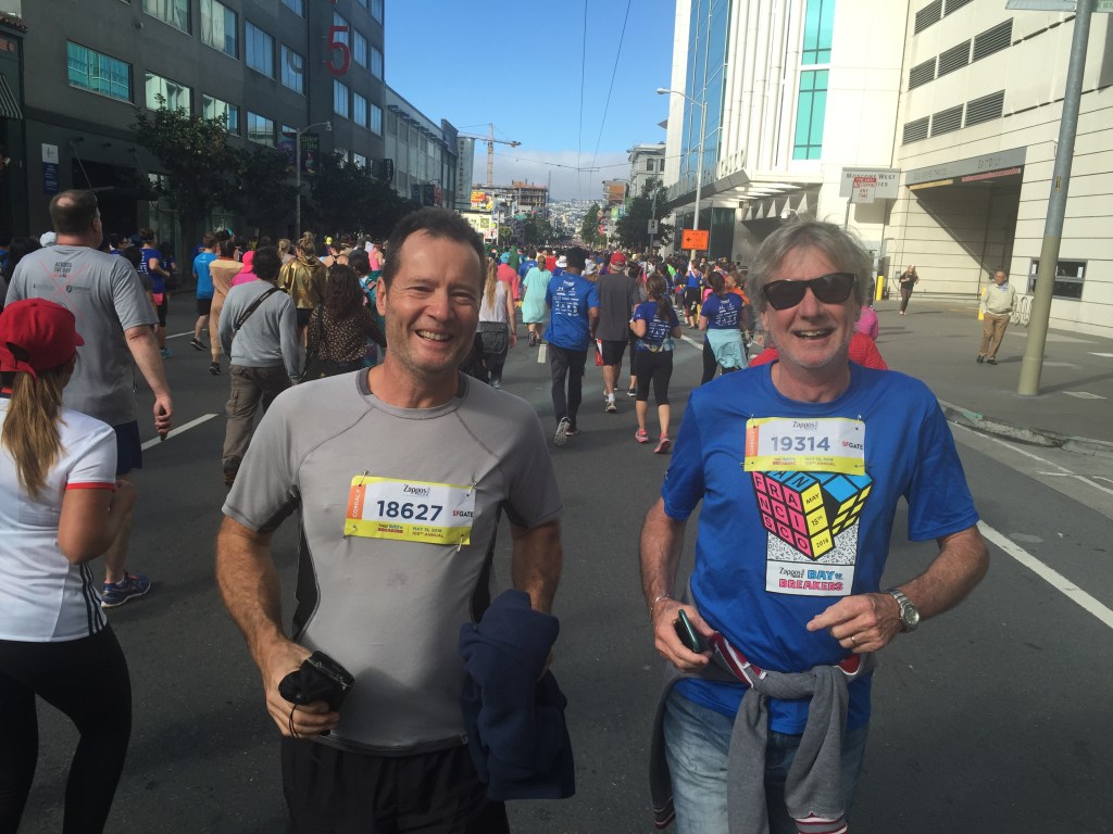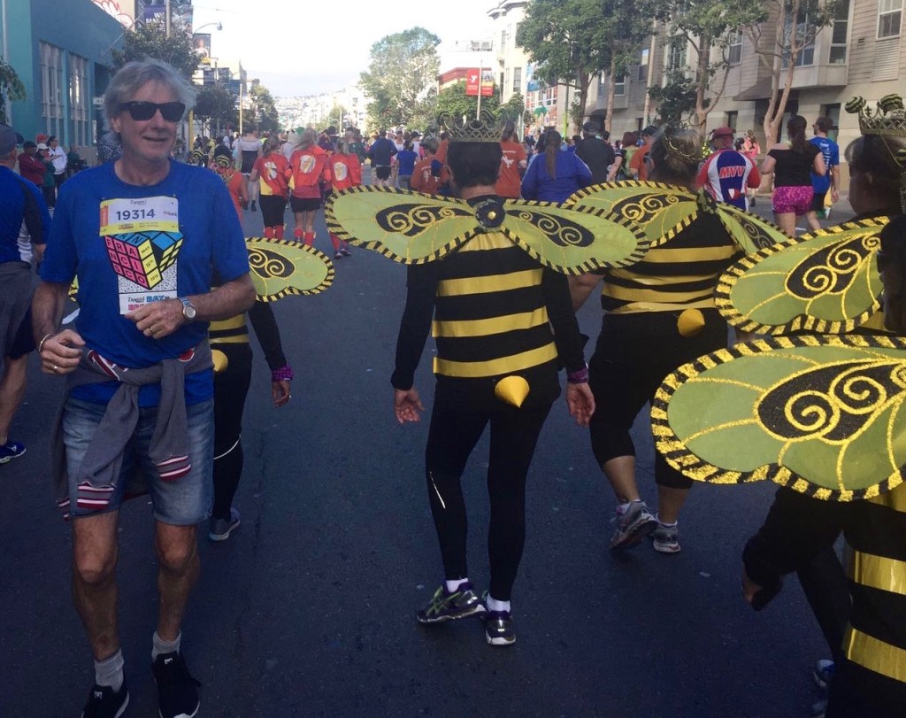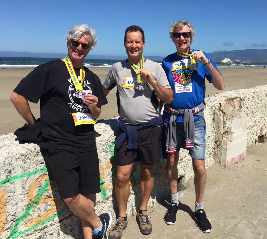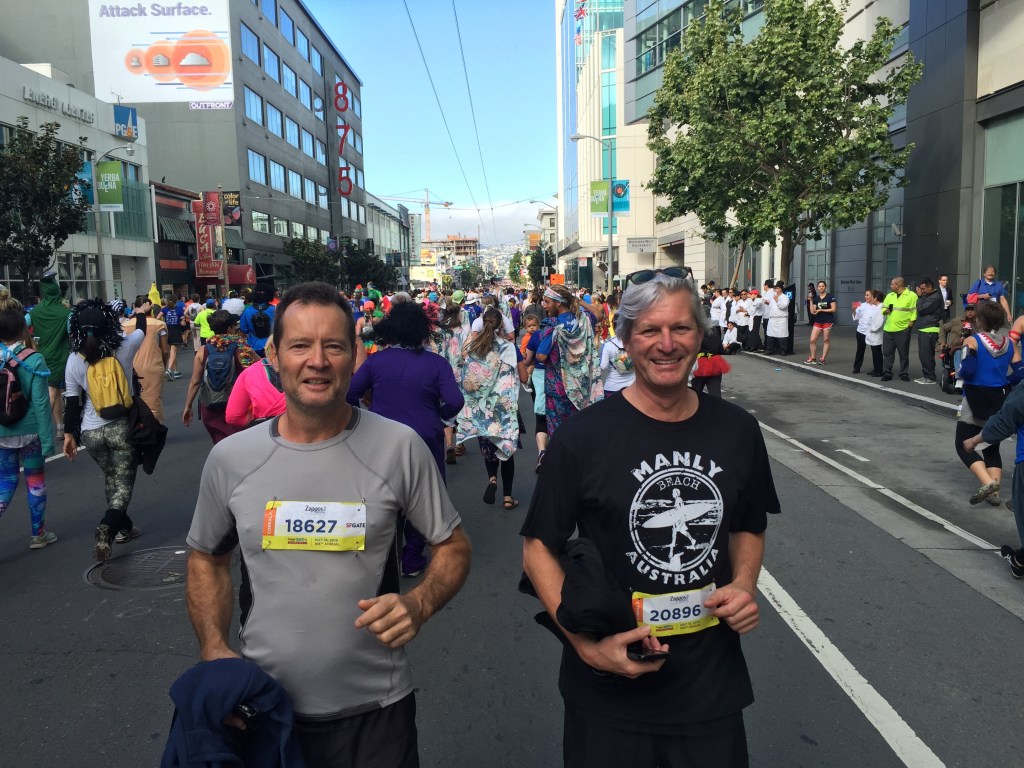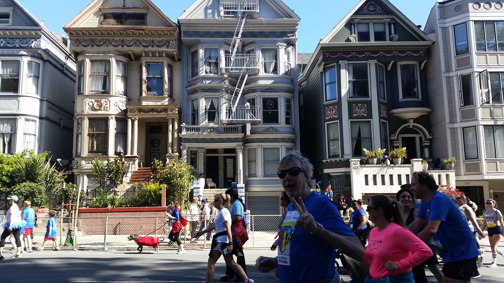 Day 3 Back to our classic diner in Polk St for a hearty breakfast before the challenge of the ‘Bay to Breakers’ run this morning. We headed off to the race start for 8.45am only to discover we were in the wrong direction. 5 kms later (running and walking) we found our way to the start of this 12km run in downtown SF. We’d already done half of it before we started! Steve was at the starting line at 7am (over planning I think). Boxy was keeping a low profile. The day was a wonderful sunny 19 deg. The run was characterised by a great sense of vibrancy & many zany people. It was a crowded street party. People dressed in all sorts of costumes, DJ’s playing music in their garages & live bands pumping out rock n roll. The pungent smell of the ‘gracious bud’ was in the air. A disconcerting aspect was the number of completely naked old men participating. Not good!! We saw lots of stunning houses, the classic American town homes. The run took us through Golden Gate Park to the Pacific Ocean. There was a huge security presence along the way. Anyway, we didn’t run much of it but the Foxes mingled with the locals & enjoyed being part of it. We returned to our Hotel to display our medals and enjoy a couple of beers before a relaxing afternoon. Noted that Mike came 22,588th in female division. Well done Mike! We met Andy & Petra at 6pm for a debrief and delivery of our bikes. Dinner tonight at Foreign Cinema in the Mission District. Brilliant. Back to the hotel for a few B&C’s and off to rearrange our packing for the bike and sleep.